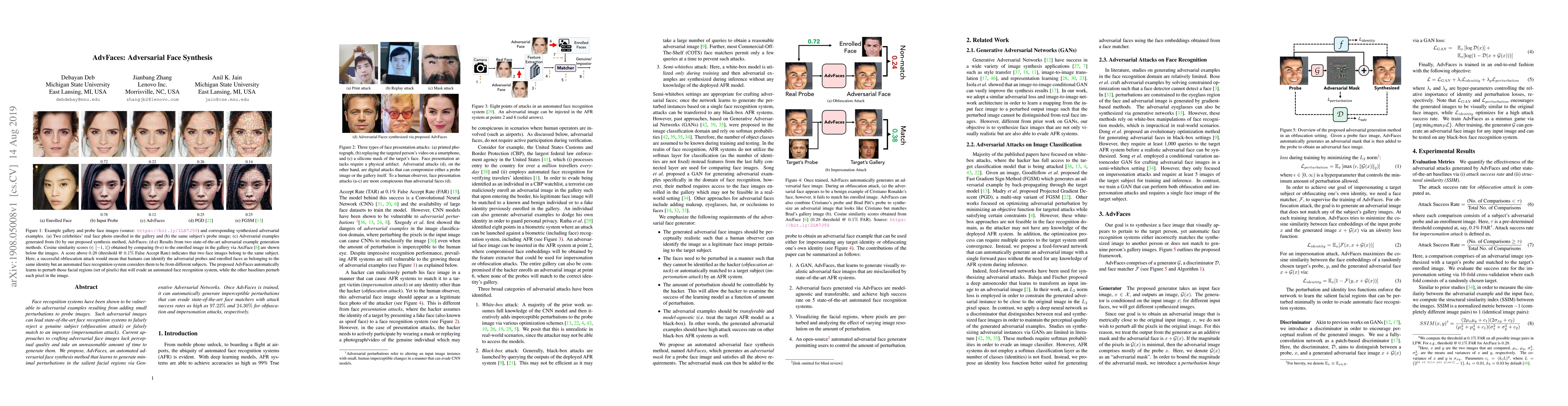 AdvFaces introduces an automated method for generating adversarial face images using Generative Adversarial Networks to create minimal, imperceptible perturbations that can evade state-of-the-art face recognition systems, achieving high attack success rates for obfuscation and impersonation.