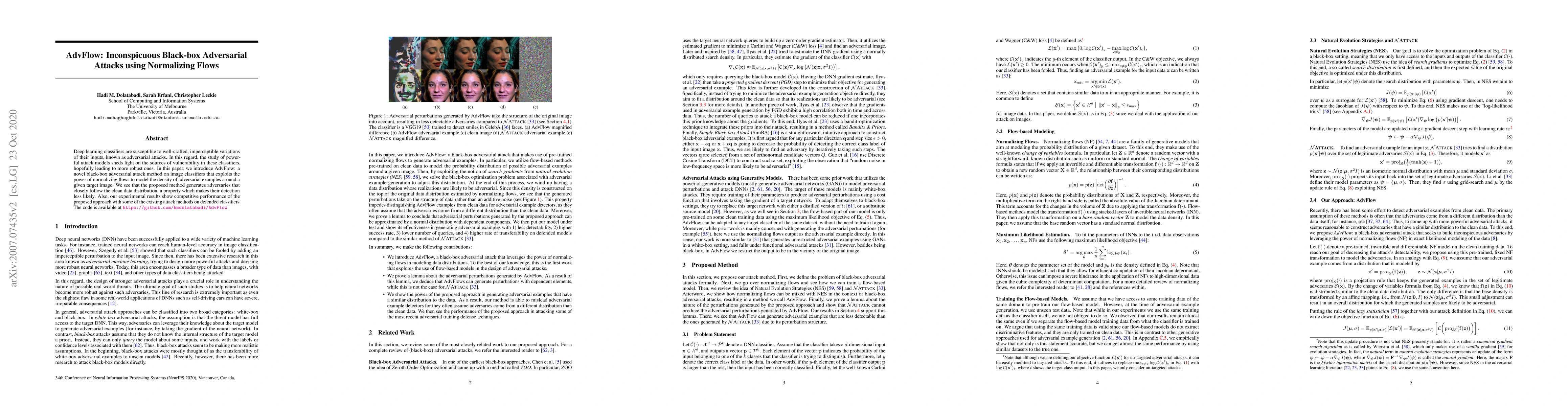 AdvFlow introduces a black-box adversarial attack method leveraging normalizing flows to model the density of adversarial examples around target images, generating imperceptible attacks that follow the clean data distribution, thus making detection difficult. Experimental results show competitive performance against existing attack methods on defended classifiers.