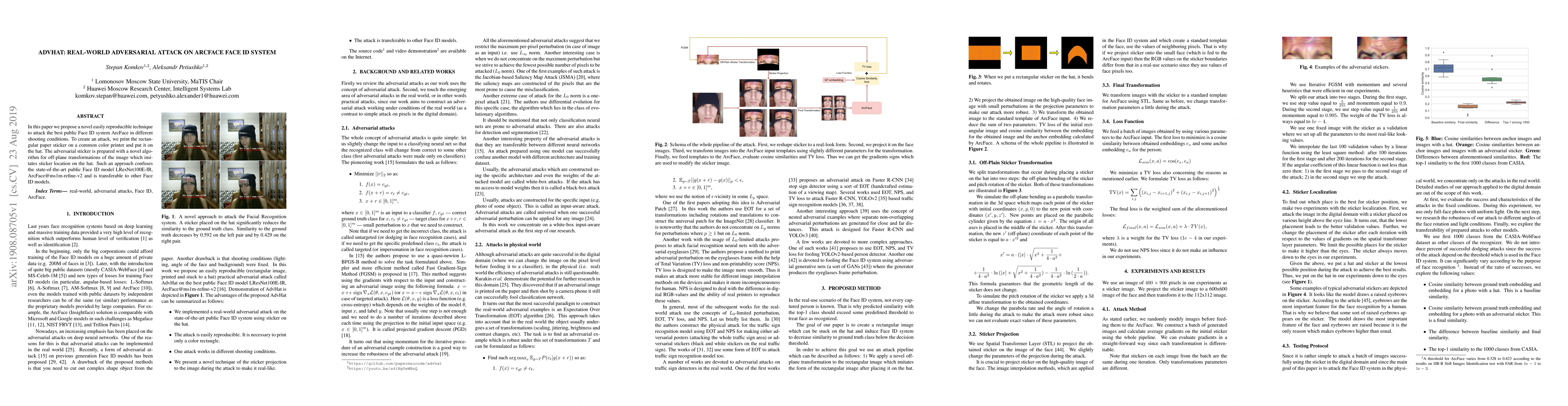 This paper introduces a reproducible method to attack the ArcFace Face ID system by using a printed sticker placed on a hat, which employs an algorithm for off-plane transformations to mimic the sticker's location. This attack successfully confuses the state-of-the-art model and is transferable to other Face ID systems.