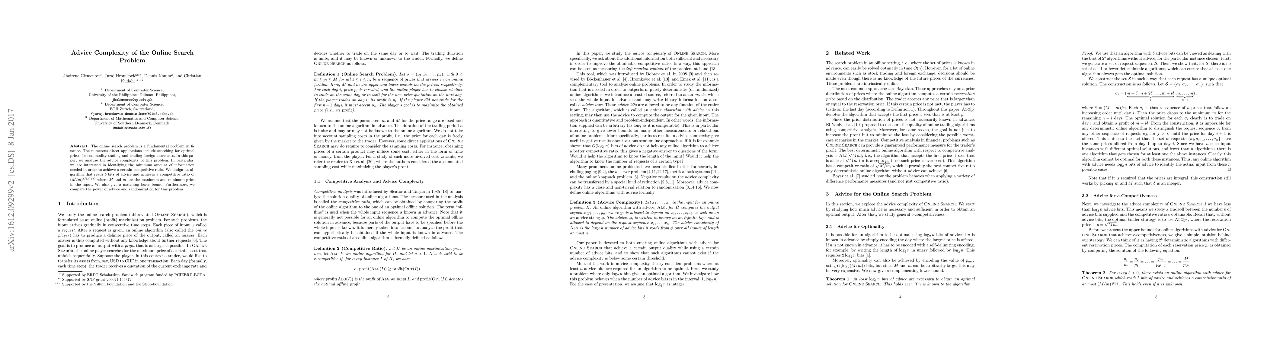 The online search problem is a fundamental problem in finance. The numerous direct applications include searching for optimal prices for commodity trading and trading foreign currencies. In this paper, we analyze the advice complexity of this problem. In particular, we are interested in identifying the minimum amount of information needed in order to achieve a certain competitive ratio. We design an algorithm that reads b bits of advice and achieves a competitive ratio of (M/m)^(1/(2^b+1)) where M and m are the maximum and minimum price in the input. We also give a matching lower bound. Furthermore, we compare the power of advice and randomization for this problem.