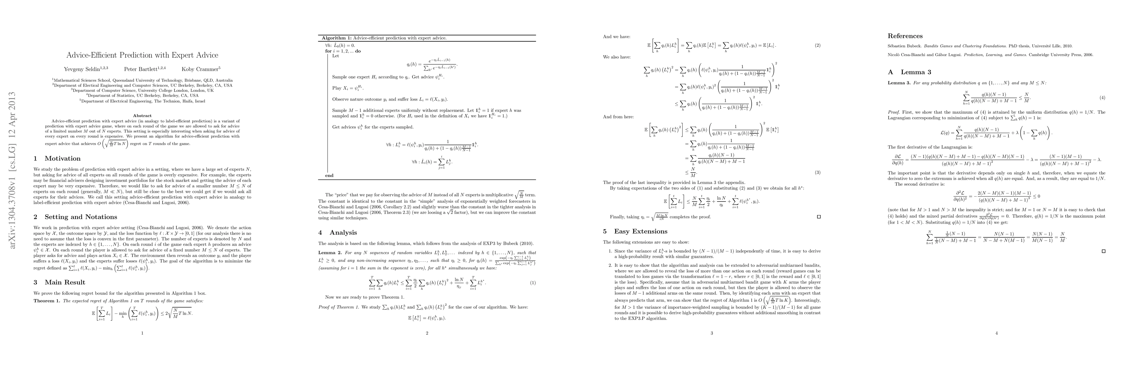 This paper proposes an algorithm for advice-efficient prediction with expert advice, achieving $O(\sqrt{\frac{N}{M}T\ln N})$ regret over $T$ rounds, where $M$ is the number of affordable experts consulted per round out of $N$ available experts. This approach is designed to minimize the cost of seeking advice from all experts.