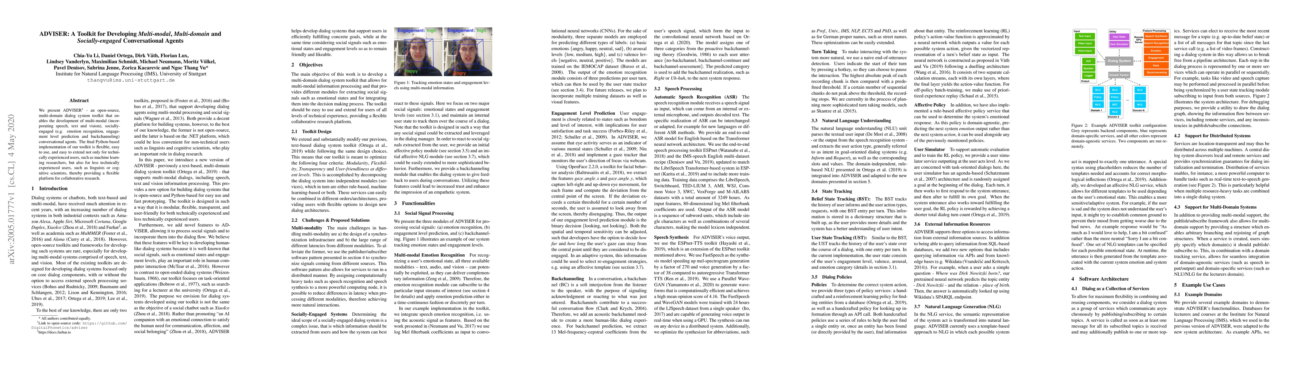 ADVISER is a versatile open-source toolkit for creating multi-modal, socially-engaged conversational agents, supporting speech, text, and vision inputs. It is designed to be accessible to both technically proficient and less experienced users, fostering interdisciplinary research.