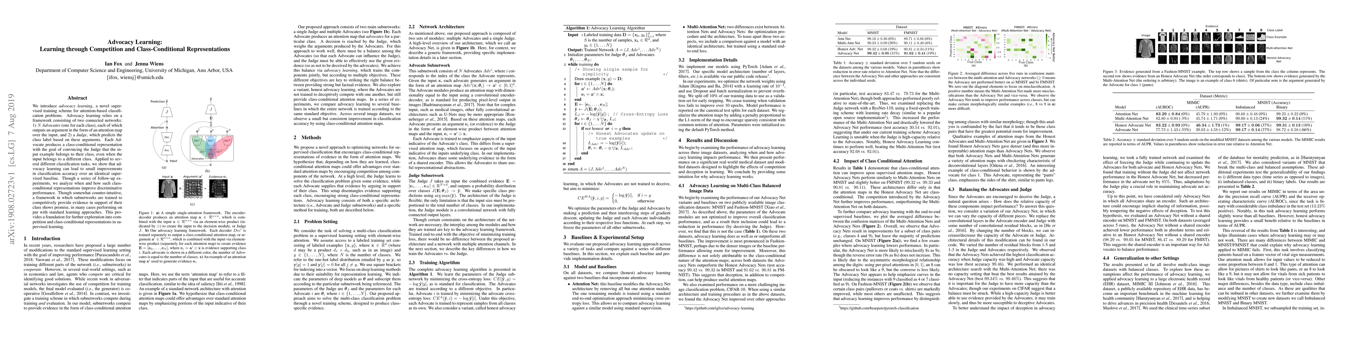 The research introduces advocacy learning, a supervised training scheme for attention-based classification problems. It consists of two subnetworks: multiple Advocates (one for each class) that produce class-conditional representations in the form of attention maps, and a Judge that predicts the class label based on these arguments. The Advocates aim to convince the Judge that the input belongs to their class, even if it doesn't.