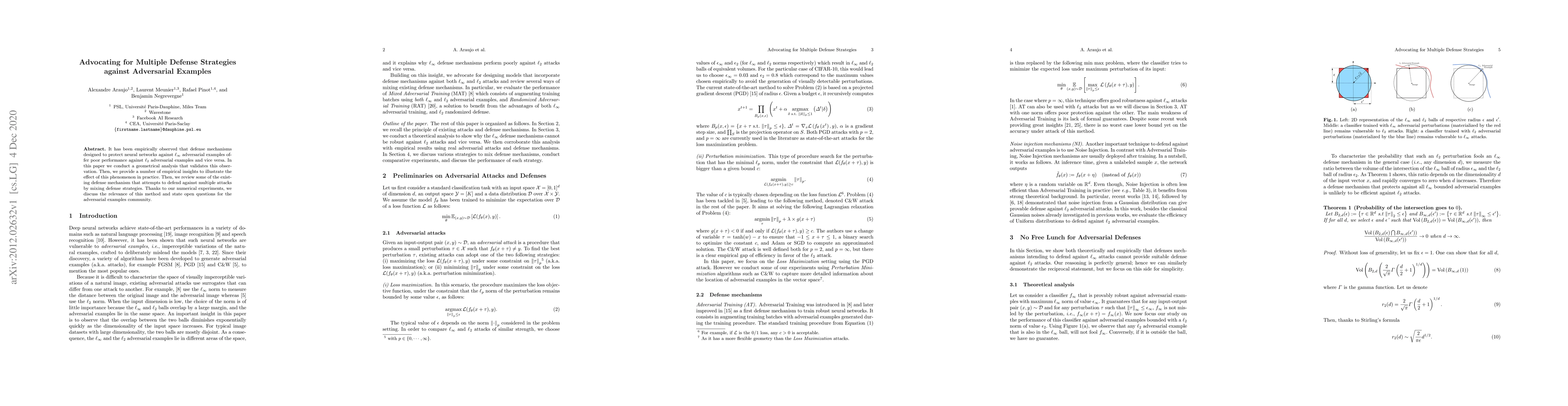 It has been empirically observed that defense mechanisms designed to protect neural networks against $\ell_\infty$ adversarial examples offer poor performance against $\ell_2$ adversarial examples and vice versa. In this paper we conduct a geometrical analysis that validates this observation. Then, we provide a number of empirical insights to illustrate the effect of this phenomenon in practice. Then, we review some of the existing defense mechanism that attempts to defend against multiple attacks by mixing defense strategies. Thanks to our numerical experiments, we discuss the relevance of this method and state open questions for the adversarial examples community.
