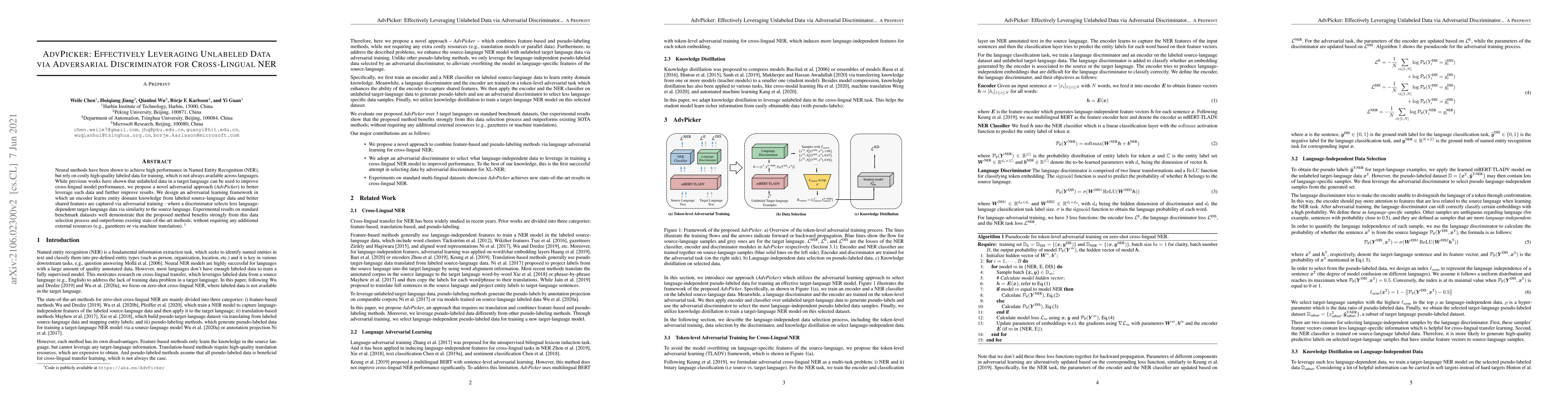 Neural methods have been shown to achieve high performance in Named Entity Recognition (NER), but rely on costly high-quality labeled data for training, which is not always available across languages. While previous works have shown that unlabeled data in a target language can be used to improve cross-lingual model performance, we propose a novel adversarial approach (AdvPicker) to better leverage such data and further improve results. We design an adversarial learning framework in which an encoder learns entity domain knowledge from labeled source-language data and better shared features are captured via adversarial training - where a discriminator selects less language-dependent target-language data via similarity to the source language. Experimental results on standard benchmark datasets well demonstrate that the proposed method benefits strongly from this data selection process and outperforms existing state-of-the-art methods; without requiring any additional external resources (e.g., gazetteers or via machine translation). The code is available at https://aka.ms/AdvPicker