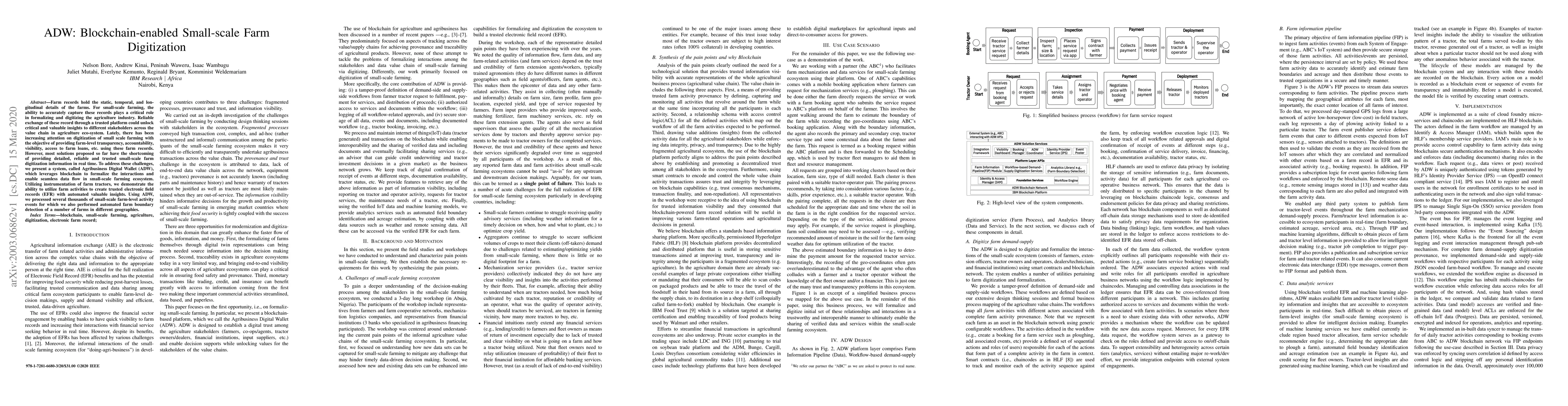 Farm records hold the static, temporal, and longitudinal details of the farms. For small-scale farming, the ability to accurately capture these records plays a critical role in formalizing and digitizing the agriculture industry. Reliable exchange of these record through a trusted platform could unlock critical and valuable insights to different stakeholders across the value chain in agriculture eco-system. Lately, there has been increasing attention on digitization of small scale farming with the objective of providing farm-level transparency, accountability, visibility, access to farm loans, etc. using these farm records. However, most solutions proposed so far have the shortcoming of providing detailed, reliable and trusted small-scale farm digitization information in real time. To address these challenges, we present a system, called Agribusiness Digital Wallet (ADW), which leverages blockchain to formalize the interactions and enable seamless data flow in small-scale farming ecosystem. Utilizing instrumentation of farm tractors, we demonstrate the ability to utilize farm activities to create trusted electronic field records (EFR) with automated valuable insights. Using ADW, we processed several thousands of small-scale farm-level activity events for which we also performed automated farm boundary detection of a number of farms in different geographies.