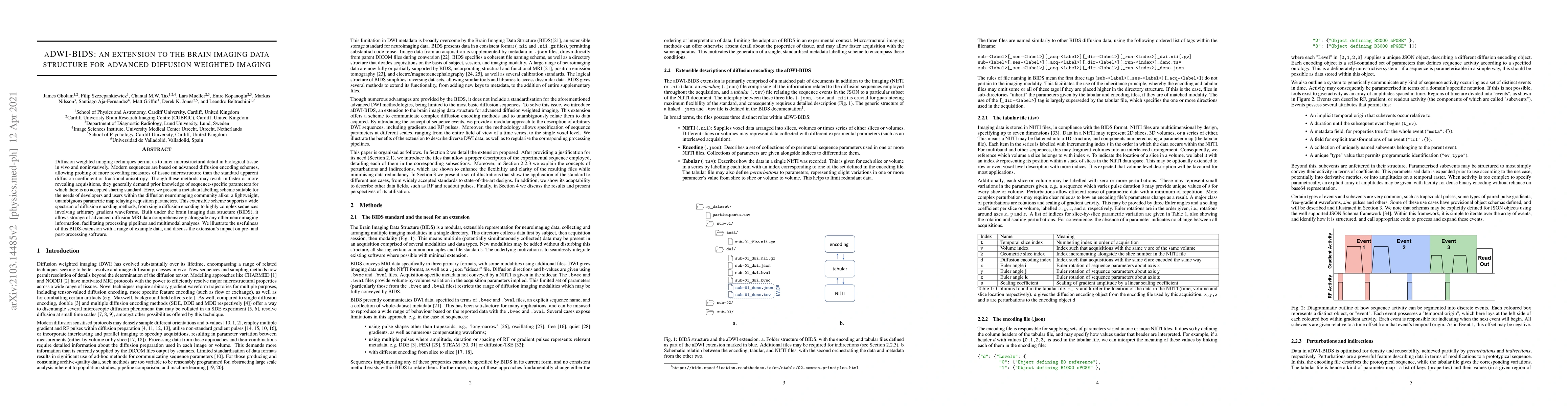 This paper presents aDWI-BIDS, an extension to the brain imaging data structure for advanced diffusion weighted imaging, providing a metadata labeling scheme for various diffusion encoding methods. This extension facilitates comprehensive storage and analysis of advanced diffusion MRI data alongside other neuroimaging data, enhancing processing pipelines and multimodal analyses.