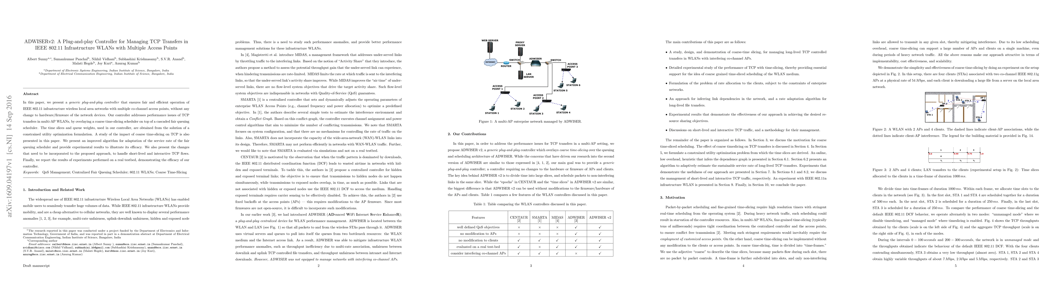 ADWISERv2 is a plug-and-play controller for managing TCP transfers in IEEE 802.11 WLANs with multiple access points, ensuring fair and efficient operation without hardware changes. It employs a time-slicing scheduler to address TCP performance issues, and experimental results show its effectiveness in real testbed scenarios.