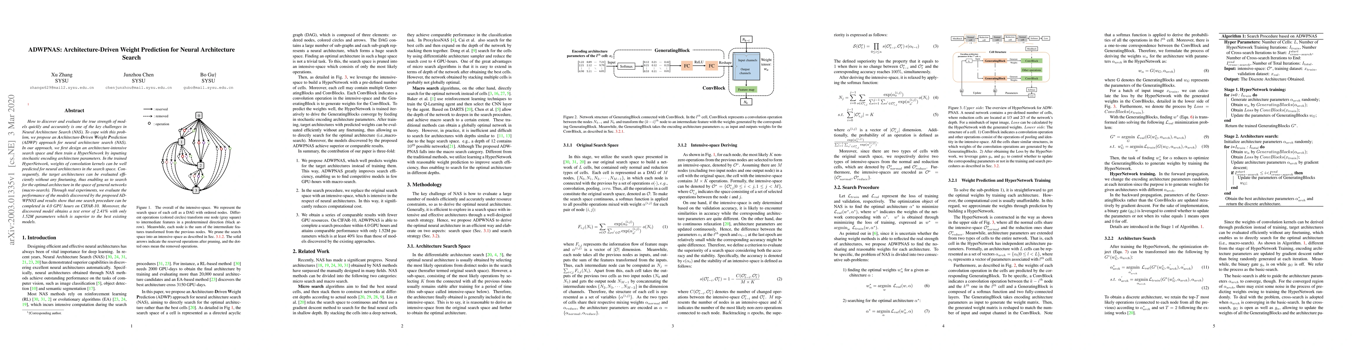 The paper proposes an Architecture-Driven Weight Prediction (ADWP) approach for Neural Architecture Search (NAS) that efficiently evaluates neural architectures without finetuning. The method uses a HyperNetwork trained on stochastic encoding to predict convolution kernel weights, enabling macro-search and significantly reducing search time.