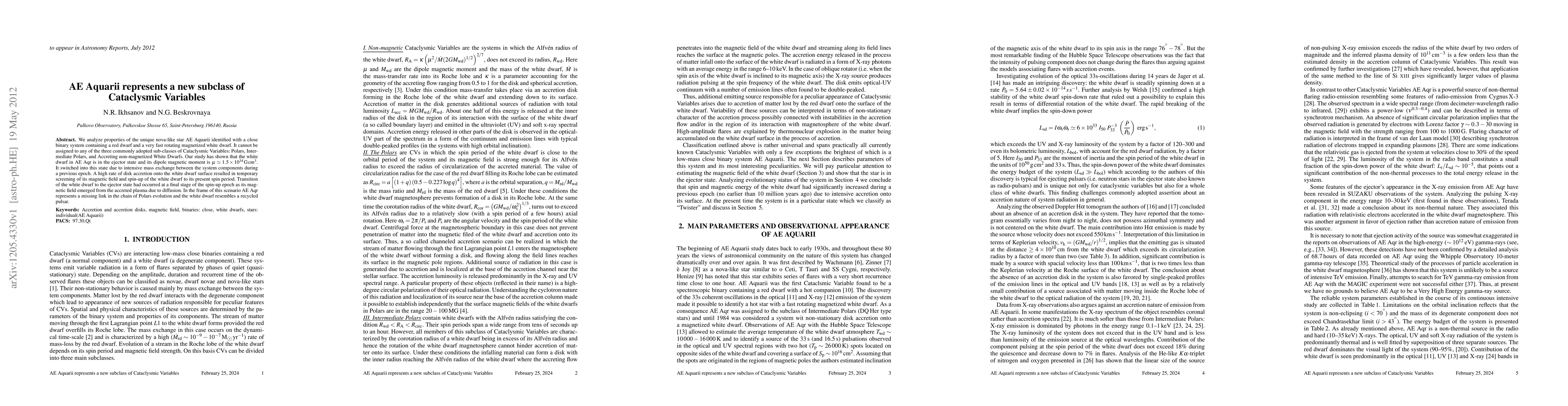 We analyze properties of the unique nova-like star AE Aquarii identified with a close binary system containing a red dwarf and a very fast rotating magnetized white dwarf. It cannot be assigned to any of the three commonly adopted sub-classes of Cataclysmic Variables: Polars, Intermediate Polars, and Accreting non-magnetized White Dwarfs. Our study has shown that the white dwarf in AE Aqr is in the ejector state and its dipole magnetic moment is $\mu ~ 1.5 \times 10^{34} G cm^3$. It switched into this state due to intensive mass exchange between the system components during a previous epoch. A high rate of disk accretion onto the white dwarf surface resulted in temporary screening of its magnetic field and spin-up of the white dwarf to its present spin period. Transition of the white dwarf to the ejector state had occurred at a final stage of the spin-up epoch as its magnetic field emerged from the accreted plasma due to diffusion. In the frame of this scenario AE Aqr represents a missing link in the chain of Polars evolution and the white dwarf resembles a recycled pulsar.