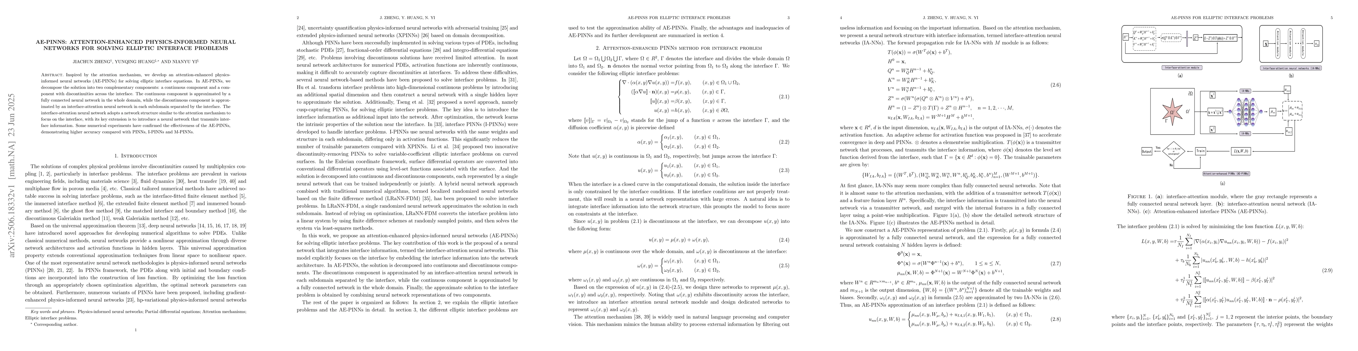 Inspired by the attention mechanism, we develop an attention-enhanced physics-informed neural networks (AE-PINNs) for solving elliptic interface equations. In AE-PINNs, we decompose the solution into two complementary components: a continuous component and a component with discontinuities across the interface. The continuous component is approximated by a fully connected neural network in the whole domain, while the discontinuous component is approximated by an interface-attention neural network in each subdomain separated by the interface. The interface-attention neural network adopts a network structure similar to the attention mechanism to focus on the interface, with its key extension is to introduce a neural network that transmits interface information. Some numerical experiments have confirmed the effectiveness of the AE-PINNs, demonstrating higher accuracy compared with PINNs, I-PINNs and M-PINNs.