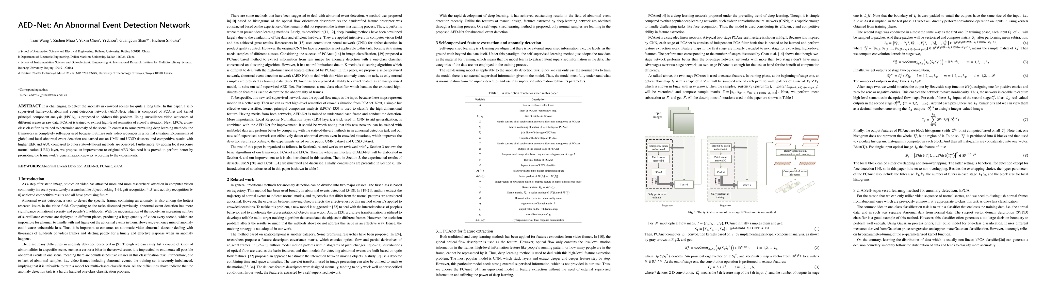 The paper proposes AED-Net, a self-supervised framework combining PCAnet and kPCA for detecting anomalies in crowded scenes using surveillance videos. The enhanced version with an added LRN layer shows improved generalization and outperforms other methods on UMN and UCSD datasets.