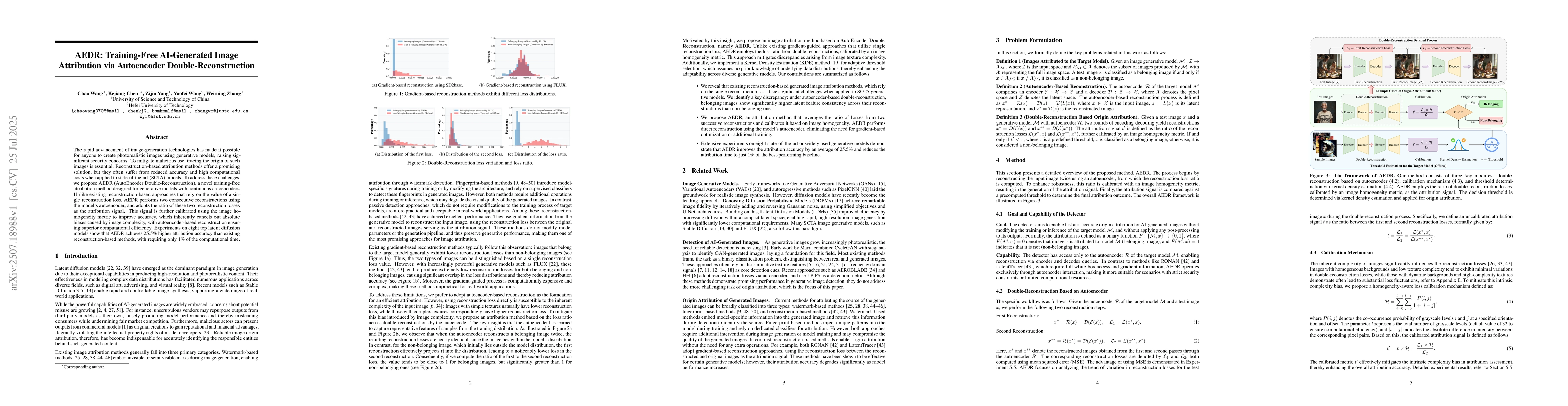 The rapid advancement of image-generation technologies has made it possible for anyone to create photorealistic images using generative models, raising significant security concerns. To mitigate malicious use, tracing the origin of such images is essential. Reconstruction-based attribution methods offer a promising solution, but they often suffer from reduced accuracy and high computational costs when applied to state-of-the-art (SOTA) models. To address these challenges, we propose AEDR (AutoEncoder Double-Reconstruction), a novel training-free attribution method designed for generative models with continuous autoencoders. Unlike existing reconstruction-based approaches that rely on the value of a single reconstruction loss, AEDR performs two consecutive reconstructions using the model's autoencoder, and adopts the ratio of these two reconstruction losses as the attribution signal. This signal is further calibrated using the image homogeneity metric to improve accuracy, which inherently cancels out absolute biases caused by image complexity, with autoencoder-based reconstruction ensuring superior computational efficiency. Experiments on eight top latent diffusion models show that AEDR achieves 25.5% higher attribution accuracy than existing reconstruction-based methods, while requiring only 1% of the computational time.