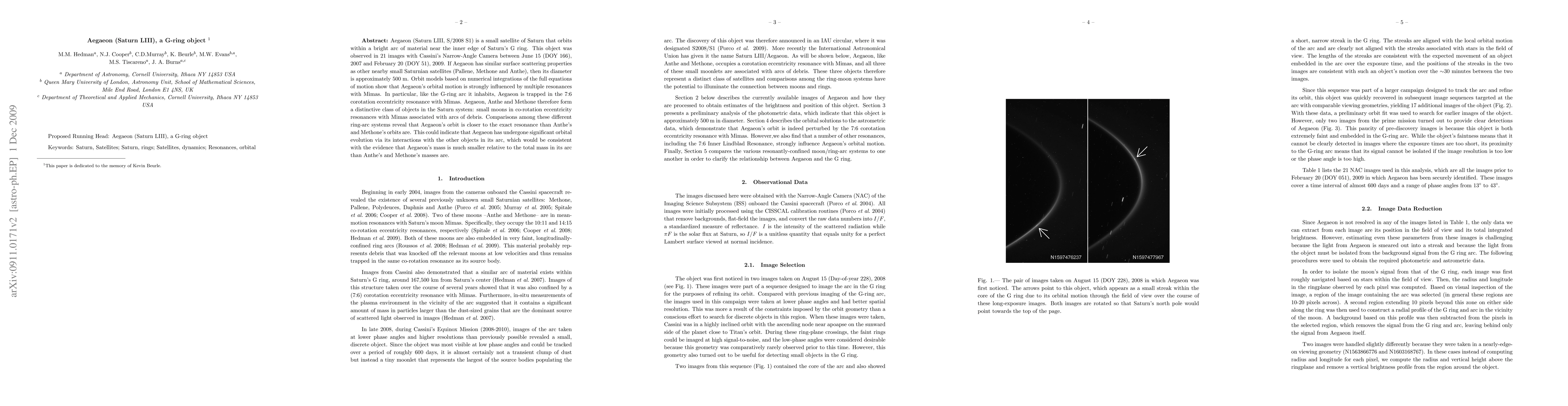 Aegaeon (Saturn LIII) is a small satellite orbiting within Saturn's G ring's bright arc, observed by Cassini. Its orbit is influenced by resonances with Mimas, placing it in a 7:6 corotation eccentricity resonance, indicating significant orbital evolution.