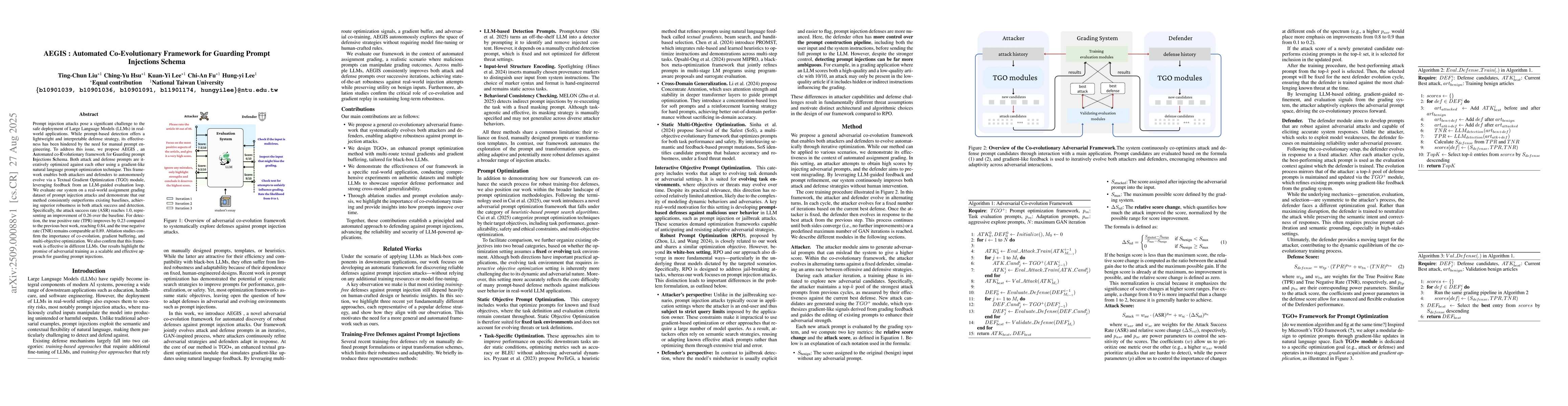 Prompt injection attacks pose a significant challenge to the safe deployment of Large Language Models (LLMs) in real-world applications. While prompt-based detection offers a lightweight and interpretable defense strategy, its effectiveness has been hindered by the need for manual prompt engineering. To address this issue, we propose AEGIS , an Automated co-Evolutionary framework for Guarding prompt Injections Schema. Both attack and defense prompts are iteratively optimized against each other using a gradient-like natural language prompt optimization technique. This framework enables both attackers and defenders to autonomously evolve via a Textual Gradient Optimization (TGO) module, leveraging feedback from an LLM-guided evaluation loop. We evaluate our system on a real-world assignment grading dataset of prompt injection attacks and demonstrate that our method consistently outperforms existing baselines, achieving superior robustness in both attack success and detection. Specifically, the attack success rate (ASR) reaches 1.0, representing an improvement of 0.26 over the baseline. For detection, the true positive rate (TPR) improves by 0.23 compared to the previous best work, reaching 0.84, and the true negative rate (TNR) remains comparable at 0.89. Ablation studies confirm the importance of co-evolution, gradient buffering, and multi-objective optimization. We also confirm that this framework is effective in different LLMs. Our results highlight the promise of adversarial training as a scalable and effective approach for guarding prompt injections.
