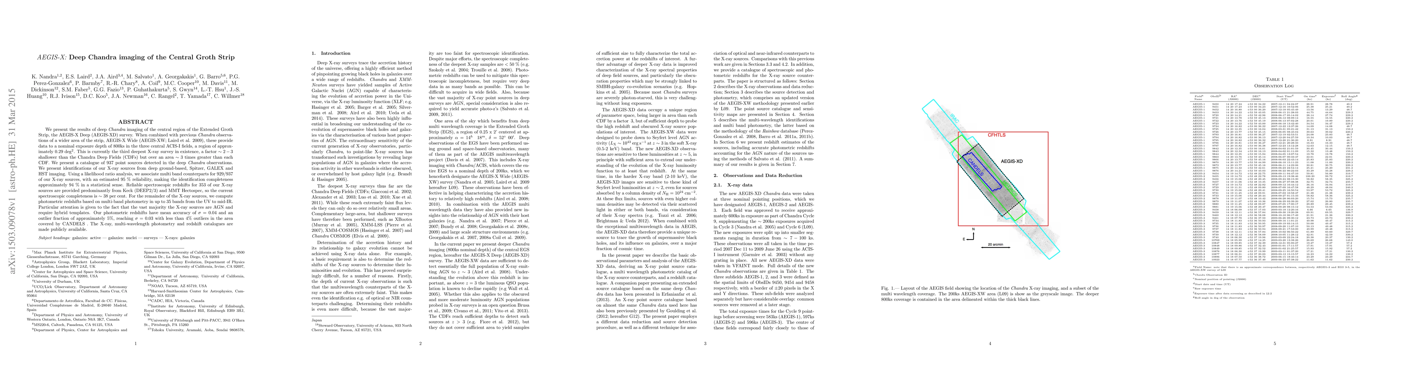 This paper reports on deep Chandra X-ray observations in the central region of the Extended Groth Strip, creating a catalogue of 937 point sources. The study combines these results with previous observations to provide a comprehensive X-ray survey, identifying 929 sources with multi-band counterparts and determining redshifts for 353 sources, with photometric redshifts for the rest.