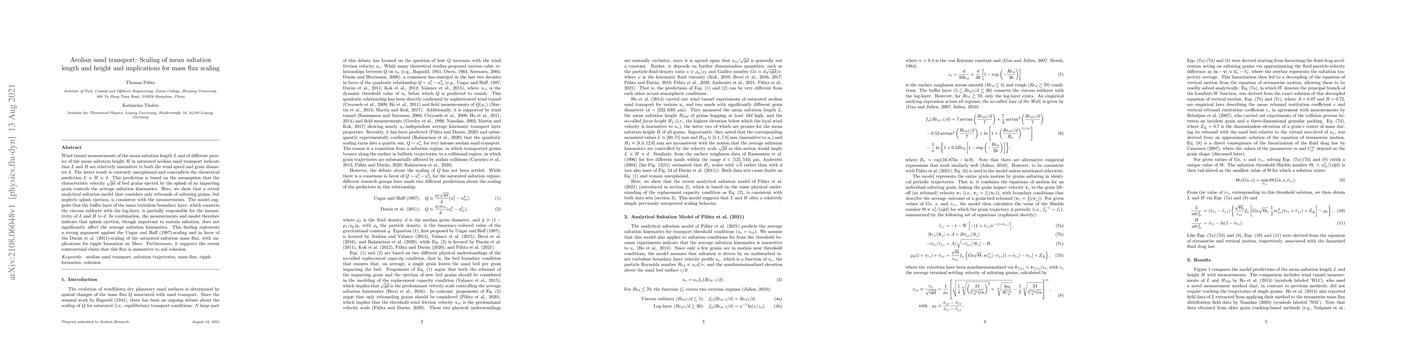 This paper finds that mean saltation length and height in aeolian sand transport are largely unaffected by wind speed and grain diameter, contrary to theoretical predictions. An analytical model that excludes splash ejection aligns with these observations, suggesting the buffer layer of the turbulent boundary layer plays a role. This supports the Duran et al. scaling for saltation mass flux and implies that this flux is independent of soil cohesion, with implications for Martian ripple formation.