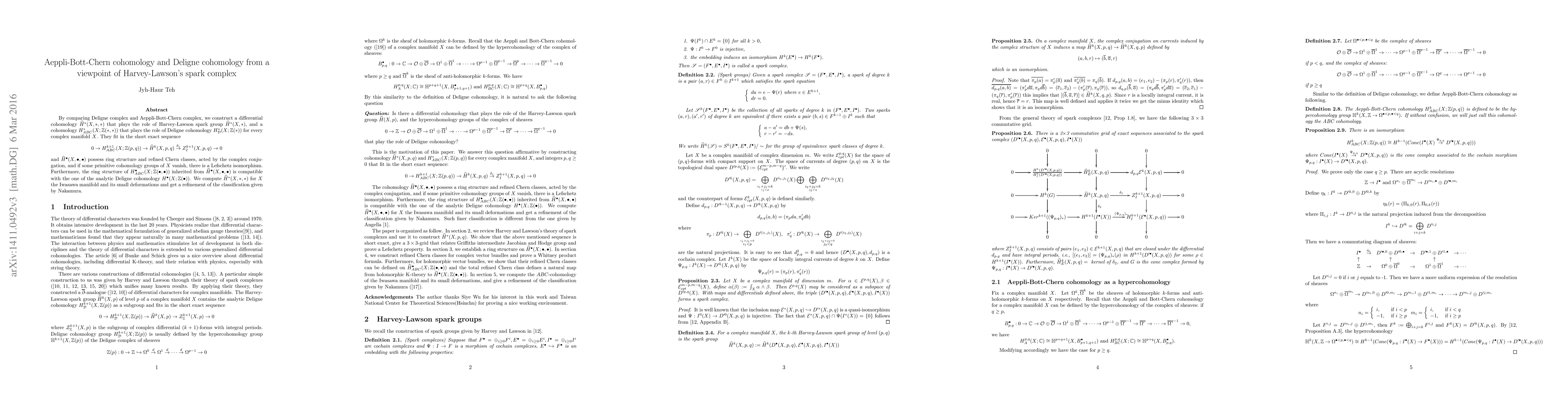 This research constructs a differential cohomology $\widehat{H}^*(X, *, *)$ based on Harvey-Lawson's spark complex, linking it to both Aeppli-Bott-Chern and Deligne cohomologies. It reveals a ring structure with refined Chern classes and Lefschetz isomorphisms under certain conditions, and computes $\widehat{H}^*(X, *, *)$ for the Iwasawa manifold and its deformations.