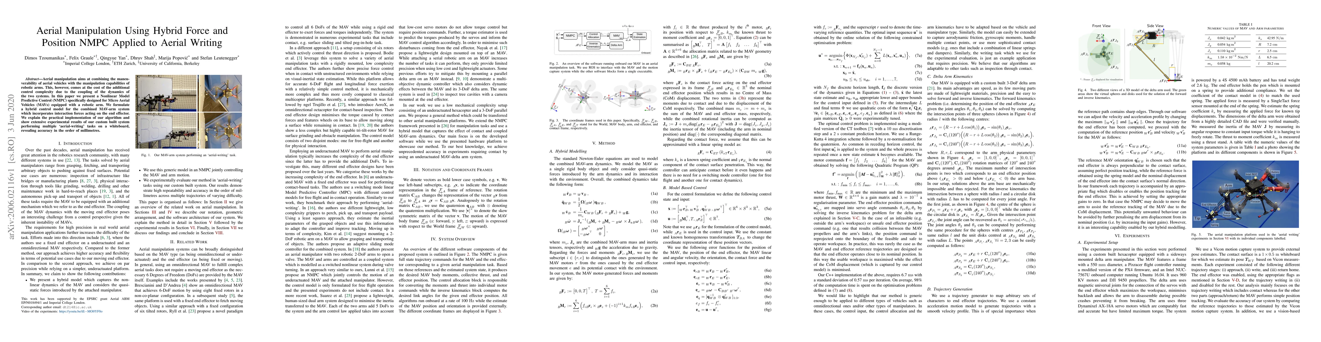Aerial manipulation aims at combining the manoeuvrability of aerial vehicles with the manipulation capabilities of robotic arms. This, however, comes at the cost of the additional control complexity due to the coupling of the dynamics of the two systems. In this paper we present a NMPC specifically designed for MAVs equipped with a robotic arm. We formulate a hybrid control model for the combined MAV-arm system which incorporates interaction forces acting on the end effector. We explain the practical implementation of our algorithm and show extensive experimental results of our custom built system performing multiple aerial-writing tasks on a whiteboard, revealing accuracy in the order of millimetres.