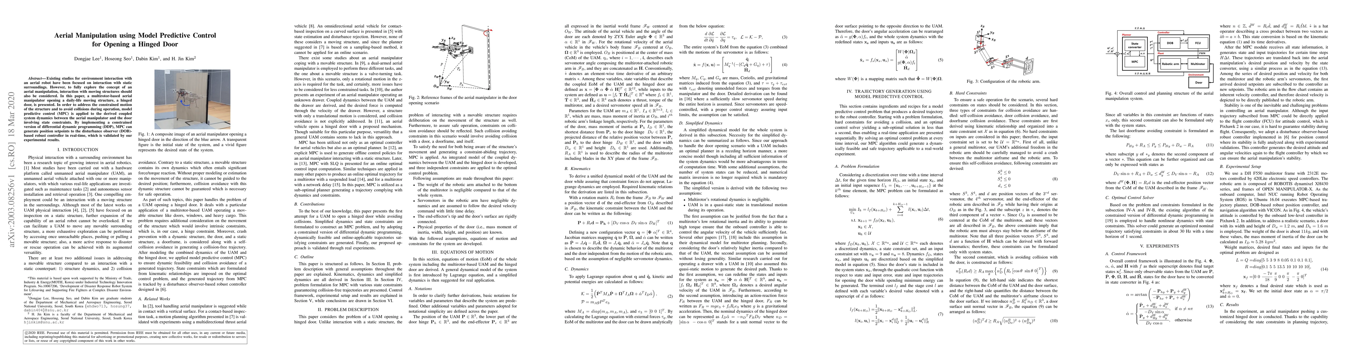 This paper presents a multirotor-based aerial manipulator using model predictive control (MPC) to open a hinged door, addressing the challenge of constrained motion and collision avoidance. The approach employs a constrained version of differential dynamic programming (DDP) within MPC to generate real-time position setpoints, validated through experimental results.