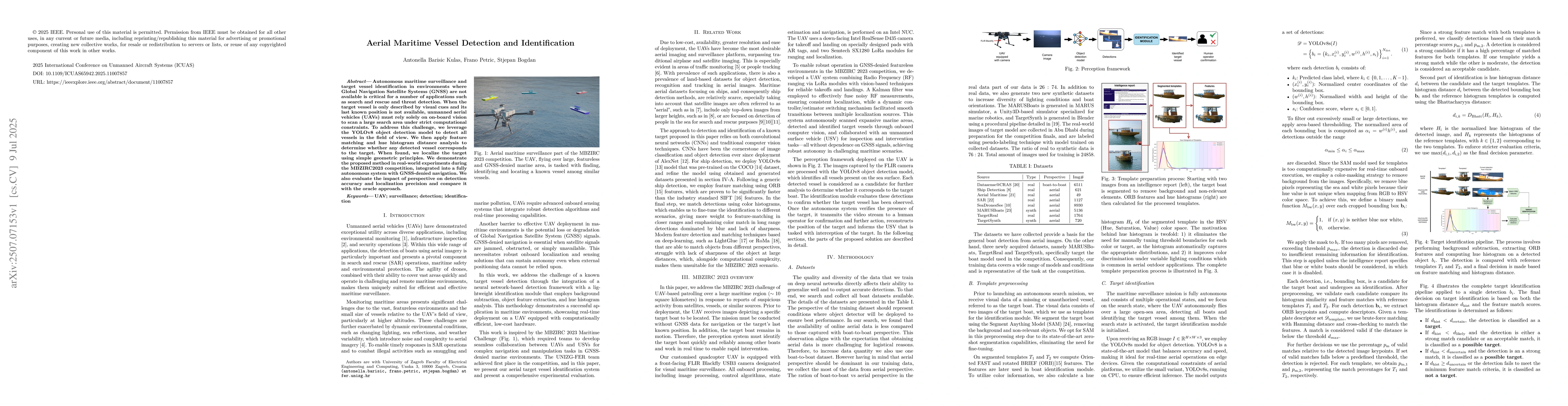 Autonomous maritime surveillance and target vessel identification in environments where Global Navigation Satellite Systems (GNSS) are not available is critical for a number of applications such as search and rescue and threat detection. When the target vessel is only described by visual cues and its last known position is not available, unmanned aerial vehicles (UAVs) must rely solely on on-board vision to scan a large search area under strict computational constraints. To address this challenge, we leverage the YOLOv8 object detection model to detect all vessels in the field of view. We then apply feature matching and hue histogram distance analysis to determine whether any detected vessel corresponds to the target. When found, we localize the target using simple geometric principles. We demonstrate the proposed method in real-world experiments during the MBZIRC2023 competition, integrated into a fully autonomous system with GNSS-denied navigation. We also evaluate the impact of perspective on detection accuracy and localization precision and compare it with the oracle approach.