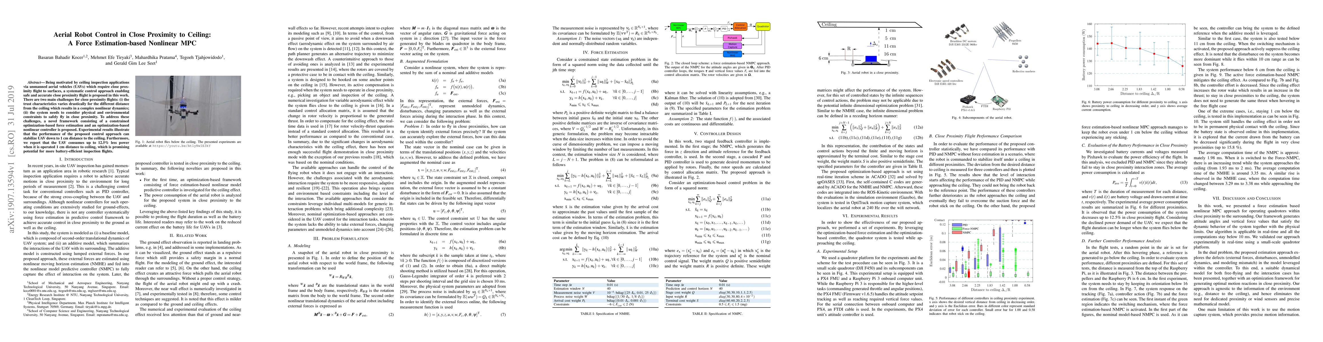 This paper proposes a control framework for unmanned aerial vehicles (UAVs) to perform safe and accurate close proximity flights to ceilings, addressing nonlinear dynamics and environmental constraints. The approach combines force estimation and nonlinear model predictive control, demonstrating stable flight at 1 cm from the ceiling and a 12.5% reduction in power consumption.