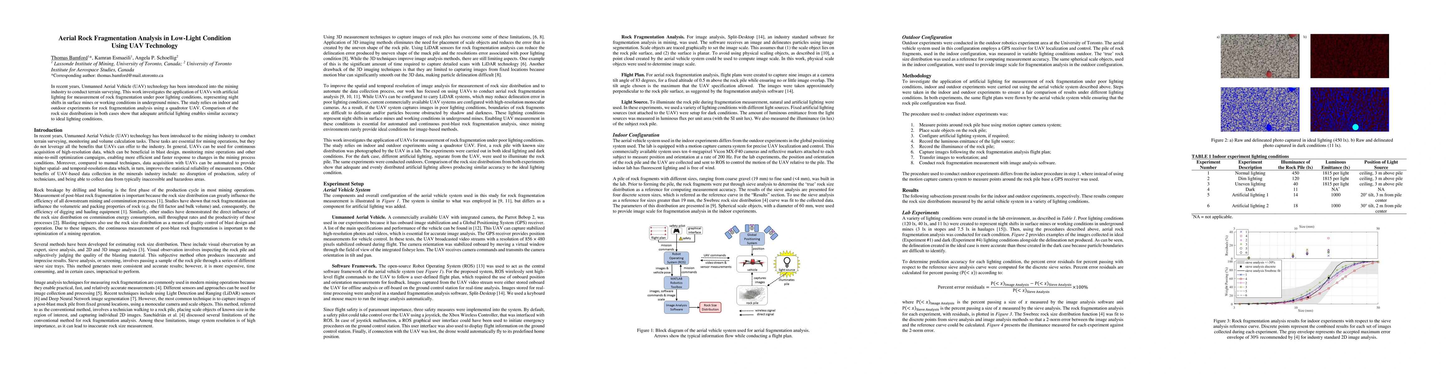 Aerial rock fragmentation analysis was conducted using a quadrotor UAV with artificial lighting for measurement of rock fragmentation under poor lighting conditions.
