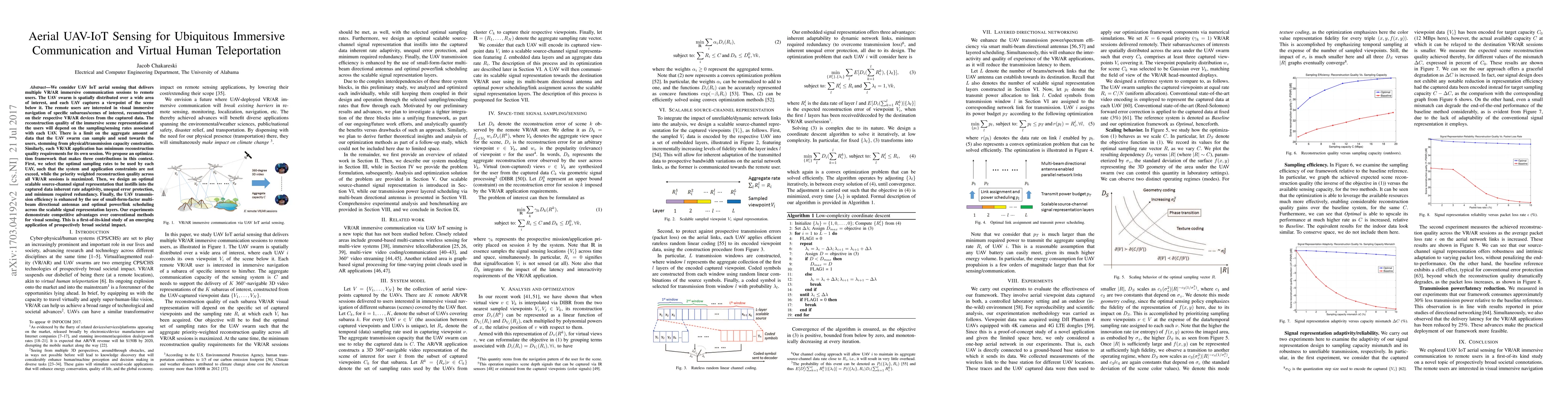 We consider UAV IoT aerial sensing that delivers multiple VR/AR immersive communication sessions to remote users. The UAV swarm is spatially distributed over a wide area of interest, and each UAV captures a viewpoint of the scene below it. The remote users are interested in visual immersive navigation of specific subareas/scenes of interest, reconstructed on their respective VR/AR devices from the captured data. The reconstruction quality of the immersive scene representations at the users will depend on the sampling/sensing rates associated with each UAV. There is a limit on the aggregate amount of data that the UAV swarm can sample and send towards the users, stemming from physical/transmission capacity constraints. Similarly, each VR/AR application has minimum reconstruction quality requirements for its own session. We propose an optimization framework that makes three contributions in this context. First, we select the optimal sampling rates to be used by each UAV, such that the system and application constraints are not exceed, while the priority weighted reconstruction quality across all VR/AR sessions is maximized. Then, we design an optimal scalable source-channel signal representation that instills into the captured data inherent rate adaptivity, unequal error protection, and minimum required redundancy. Finally, the UAV transmission efficiency is enhanced by the use of small-form-factor multi-beam directional antennas and optimal power/link scheduling across the scalable signal representation layers. Our experiments demonstrate competitive advantages over conventional methods for visual sensing. This is a first-of-its-kind study of an emerging application of prospectively broad societal impact.