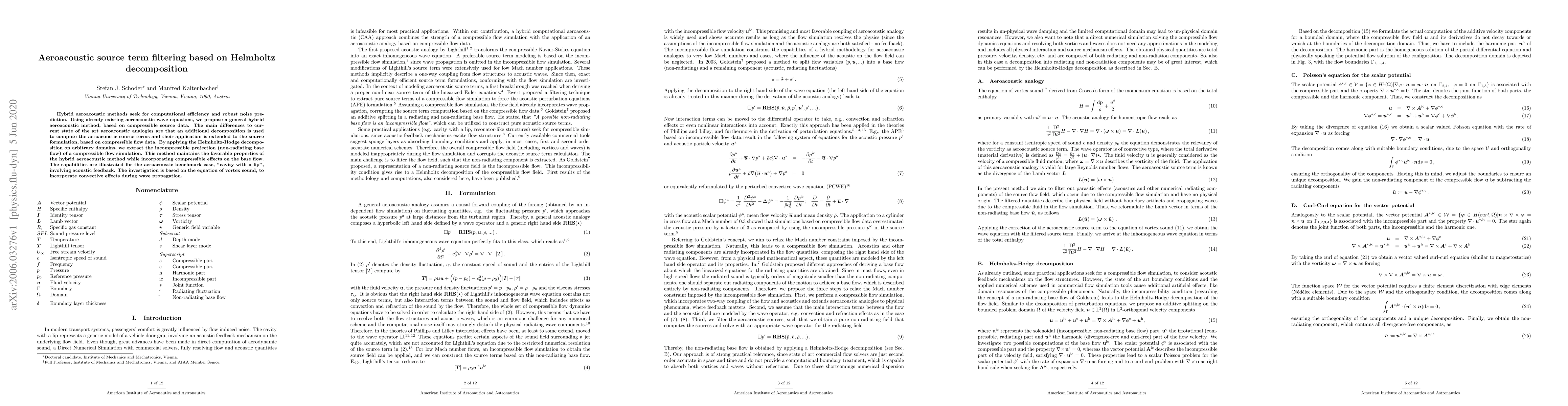 This paper proposes a hybrid aeroacoustic method using Helmholtz decomposition to filter aeroacoustic source terms based on compressible flow data. The method extracts the incompressible projection of compressible flow simulations, maintaining computational efficiency while incorporating compressible effects, and is demonstrated on the "cavity with a lip" benchmark case.