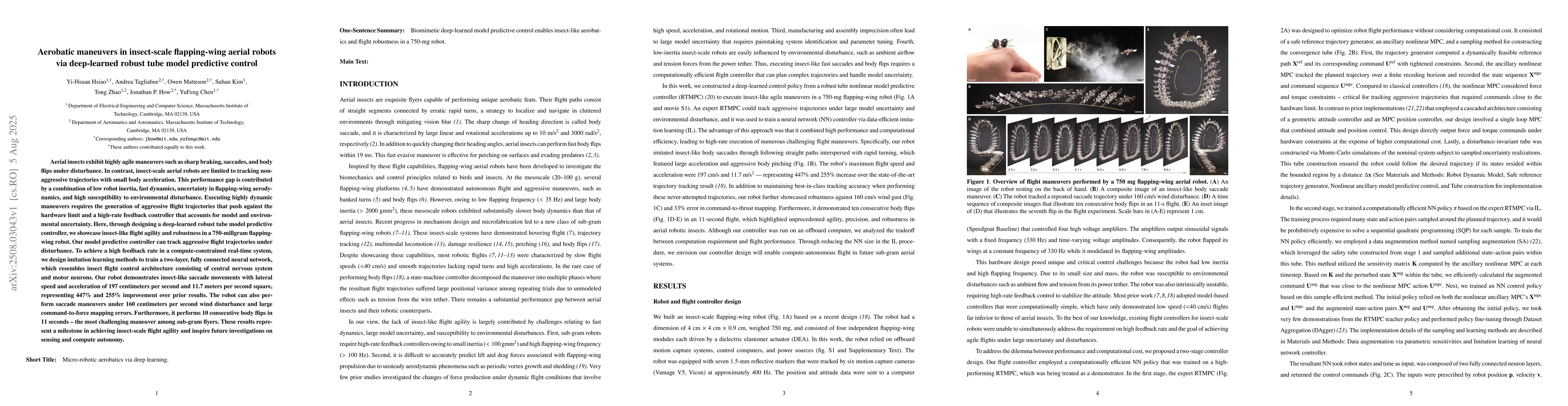 Aerial insects exhibit highly agile maneuvers such as sharp braking, saccades, and body flips under disturbance. In contrast, insect-scale aerial robots are limited to tracking non-aggressive trajectories with small body acceleration. This performance gap is contributed by a combination of low robot inertia, fast dynamics, uncertainty in flapping-wing aerodynamics, and high susceptibility to environmental disturbance. Executing highly dynamic maneuvers requires the generation of aggressive flight trajectories that push against the hardware limit and a high-rate feedback controller that accounts for model and environmental uncertainty. Here, through designing a deep-learned robust tube model predictive controller, we showcase insect-like flight agility and robustness in a 750-millgram flapping-wing robot. Our model predictive controller can track aggressive flight trajectories under disturbance. To achieve a high feedback rate in a compute-constrained real-time system, we design imitation learning methods to train a two-layer, fully connected neural network, which resembles insect flight control architecture consisting of central nervous system and motor neurons. Our robot demonstrates insect-like saccade movements with lateral speed and acceleration of 197 centimeters per second and 11.7 meters per second square, representing 447$\%$ and 255$\%$ improvement over prior results. The robot can also perform saccade maneuvers under 160 centimeters per second wind disturbance and large command-to-force mapping errors. Furthermore, it performs 10 consecutive body flips in 11 seconds - the most challenging maneuver among sub-gram flyers. These results represent a milestone in achieving insect-scale flight agility and inspire future investigations on sensing and compute autonomy.