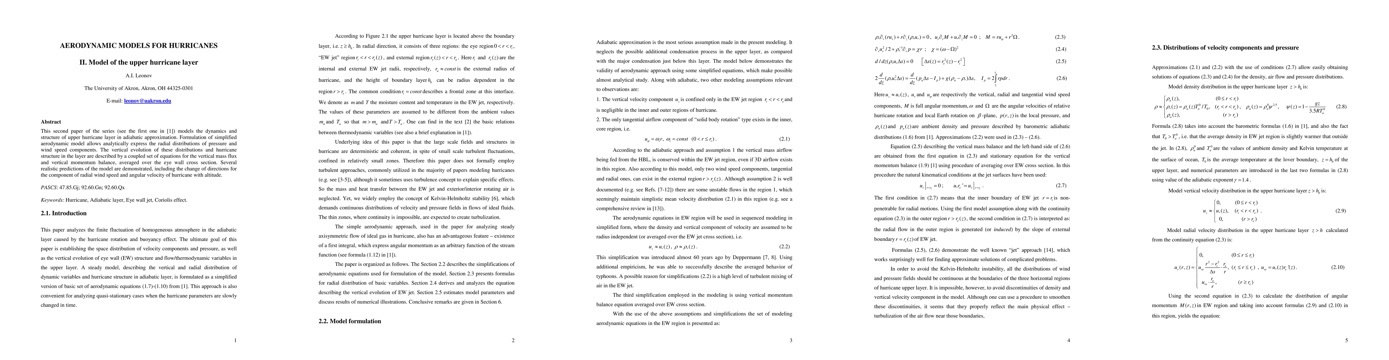 This paper presents an aerodynamic model for the upper hurricane layer, providing analytical expressions for pressure and wind speed distributions. It describes hurricane structure using equations for vertical mass flux and momentum balance, averaged over the eye wall cross section. The model accurately predicts hurricane features like wind speed direction changes with altitude.