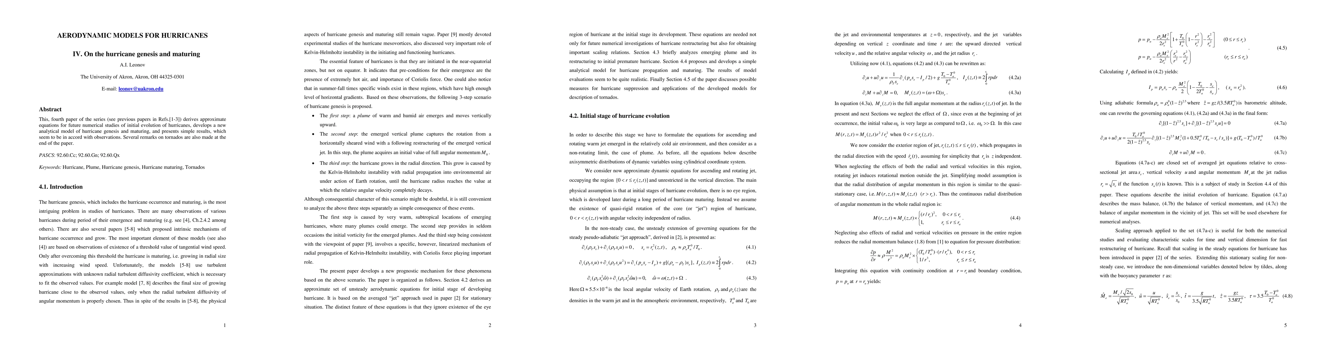 This, fourth paper of the series (see previous papers in Refs.[1-3]) derives approximate equations for future numerical studies of initial evolution of hurricanes, develops new analytical models of hurricane genesis and maturing, and presents simple results, which seems to be in accord with observations. Several remarks on tornados are also made at the end of the paper.