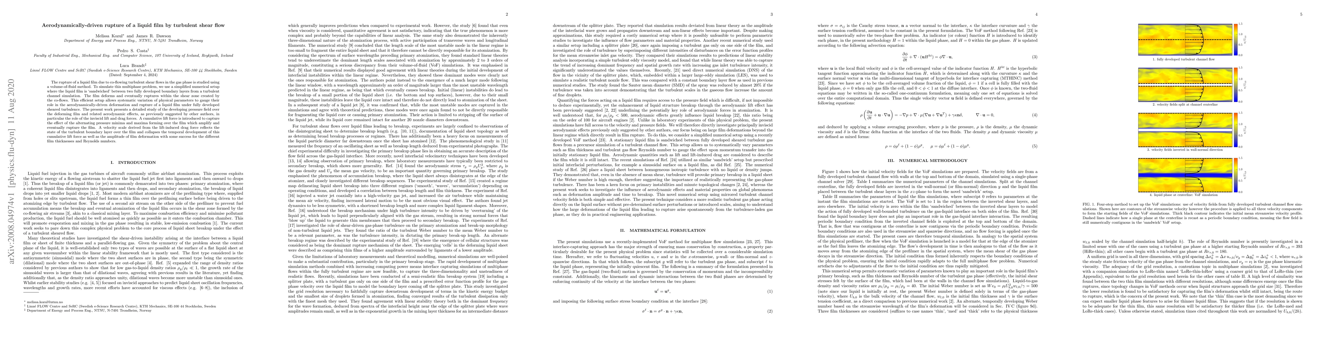 This study investigates the aerodynamic rupture of a liquid film under turbulent shear flow using a simplified numerical setup, finding that inviscid lift and drag forces play a significant role in film deformation and rupture, and a cumulative lift force model effectively captures these aerodynamic effects.