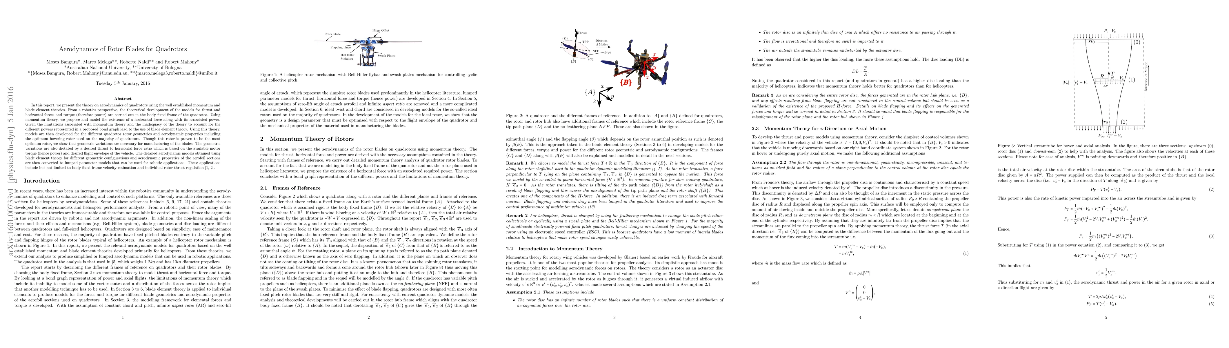 In this report, we present the theory on aerodynamics of quadrotors using the well established momentum and blade element theories. From a robotics perspective, the theoretical development of the models for thrust and horizontal forces and torque (therefore power) are carried out in the body fixed frame of the quadrotor. Using momentum theory, we propose and model the existence of a horizontal force along with its associated power. Given the limitations associated with momentum theory and the inadequacy of the theory to account for the different powers represented in a proposed bond graph lead to the use of blade element theory. Using this theory, models are then developed for the different quadrotor rotor geometries and aerodynamic properties including the optimum hovering rotor used on the majority of quadrotors. Though this rotor is proven to be the most optimum rotor, we show that geometric variations are necessary for manufacturing of the blades. The geometric variations are also dictated by a desired thrust to horizontal force ratio which is based on the available motor torque (hence power) and desired flight envelope of the vehicle. The detailed aerodynamic models obtained using blade element theory for different geometric configurations and aerodynamic properties of the aerofoil sections are then converted to lumped parameter models that can be used for robotic applications. These applications include but not limited to body fixed frame velocity estimation and individual rotor thrust regulation [1, 2].