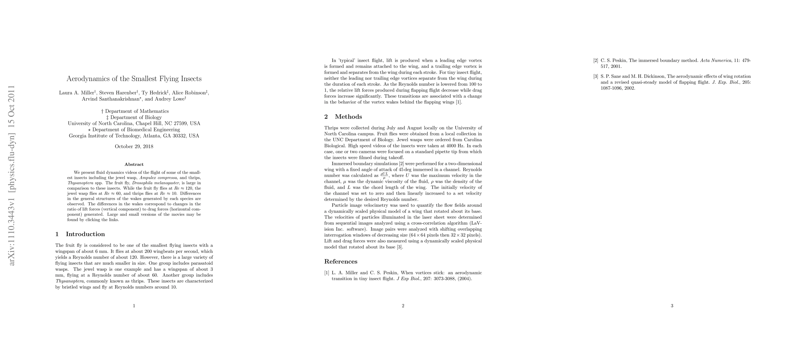 This paper examines the fluid dynamics of flight in the smallest flying insects, including jewel wasps, thrips, and fruit flies, revealing distinct wake structures and differing ratios of lift to drag forces at varying Reynolds numbers. The study highlights unique aerodynamic characteristics at micro-scale flight.