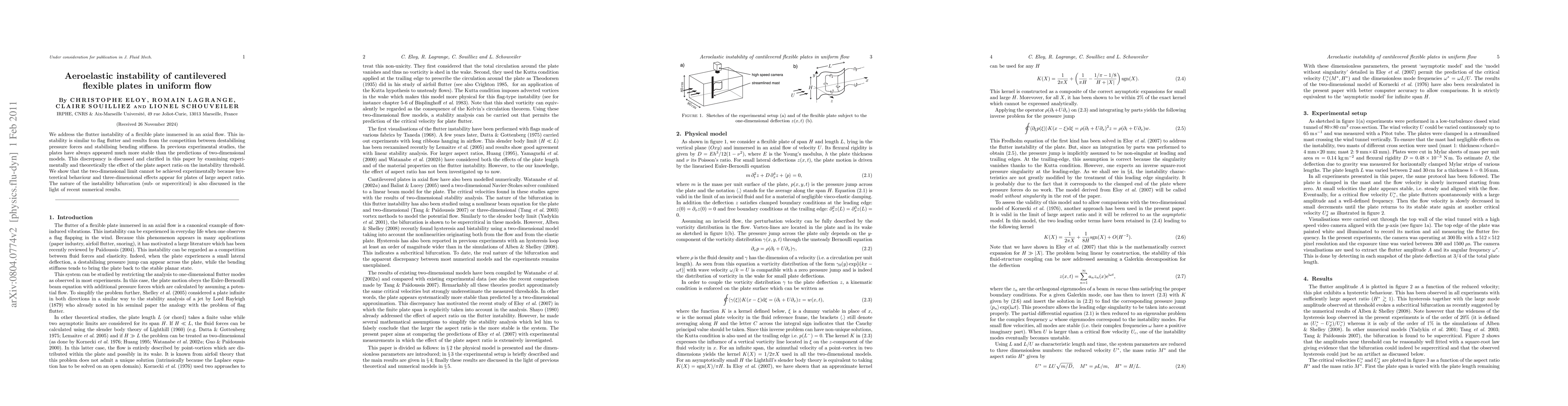 This paper investigates the aeroelastic instability of flexible cantilevered plates in uniform axial flow, explaining the discrepancy between experimental stability and two-dimensional model predictions. It highlights the influence of plate aspect ratio on the instability threshold, revealing that three-dimensional effects and hysteretic behavior prevent the two-dimensional limit from being experimentally achieved.