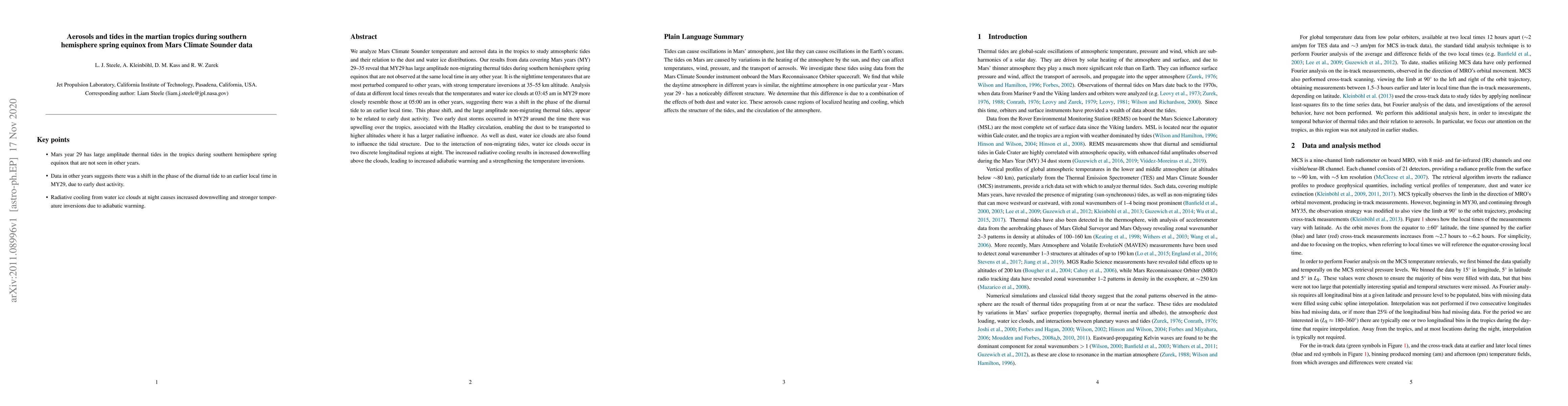 This study analyzes Mars Climate Sounder data to investigate atmospheric tides in the martian tropics during the southern hemisphere spring equinox, revealing large amplitude non-migrating thermal tides in MY29. The phase shift in diurnal tides and strong temperature inversions are linked to early dust activity and water ice clouds, which influence the tidal structure and radiative cooling.