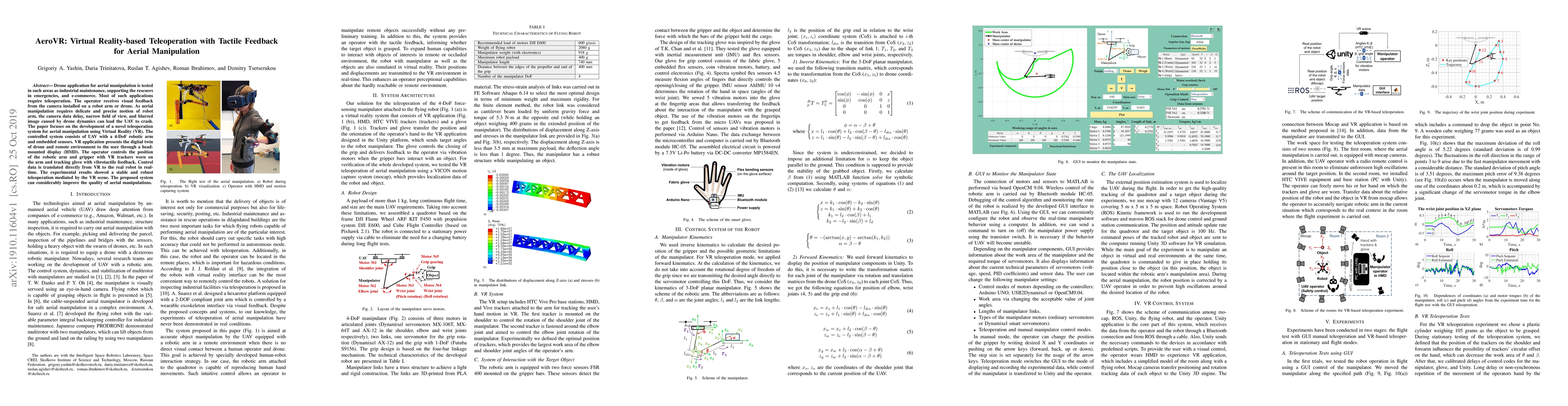 The AeroVR system employs Virtual Reality for teleoperation of drones with tactile feedback, enhancing precision in aerial manipulation tasks. Experimental results demonstrate improved stability and robustness, suggesting significant benefits for applications in industrial maintenance, emergency support, and e-commerce.