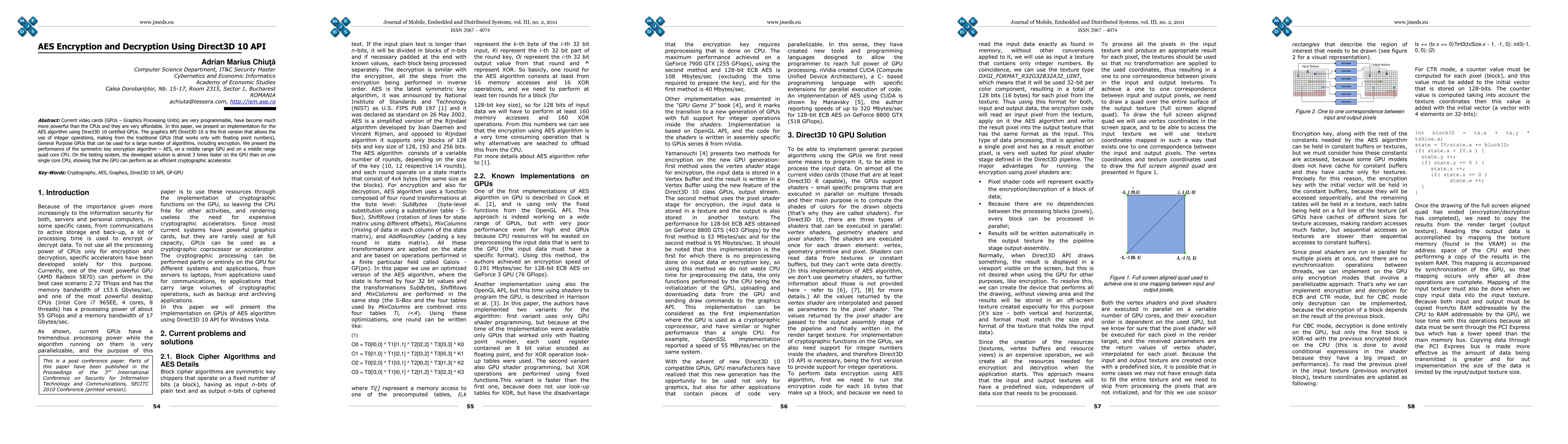 This paper implements AES encryption using Direct3D 10 on GPUs, demonstrating that GPUs can function as efficient cryptographic accelerators. Performance tests show the GPU is nearly three times faster than a single core CPU for AES encryption.