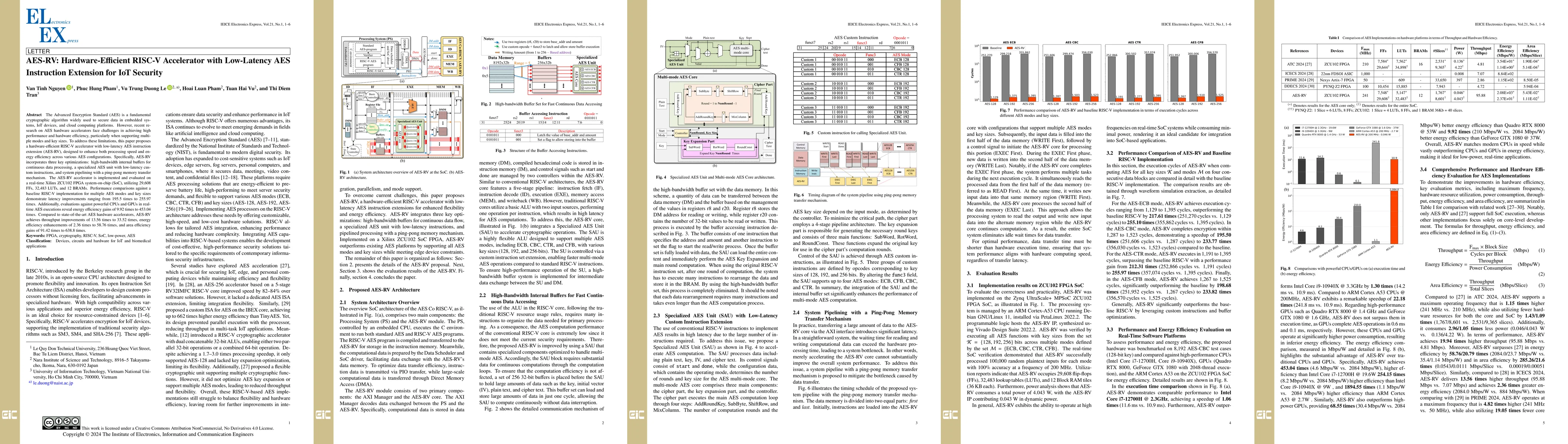 AES-RV, a hardware-efficient RISC-V accelerator with low-latency AES instruction extensions, featuring high-bandwidth internal buffers, a specialized AES unit, and a pipelined system.