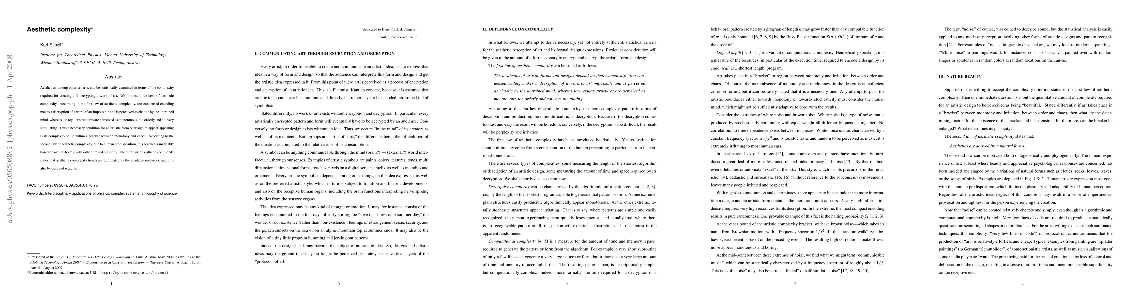 Research proposes three laws of aesthetic complexity: a work of art's appeal lies in complexity between monotony and chaos, is based on natural forms with limited plasticity, and trends are driven by available resources and cost.