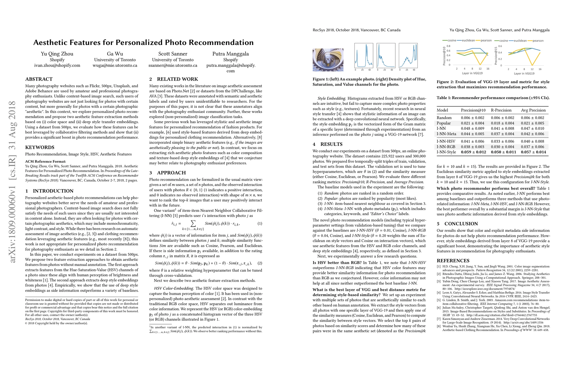 This paper proposes two aesthetic feature extraction methods for personalized photo recommendations based on color space and deep style transfer embeddings. Evaluation using a 500px dataset shows that deep style transfer embeddings significantly enhance recommendation performance over collaborative filtering methods.