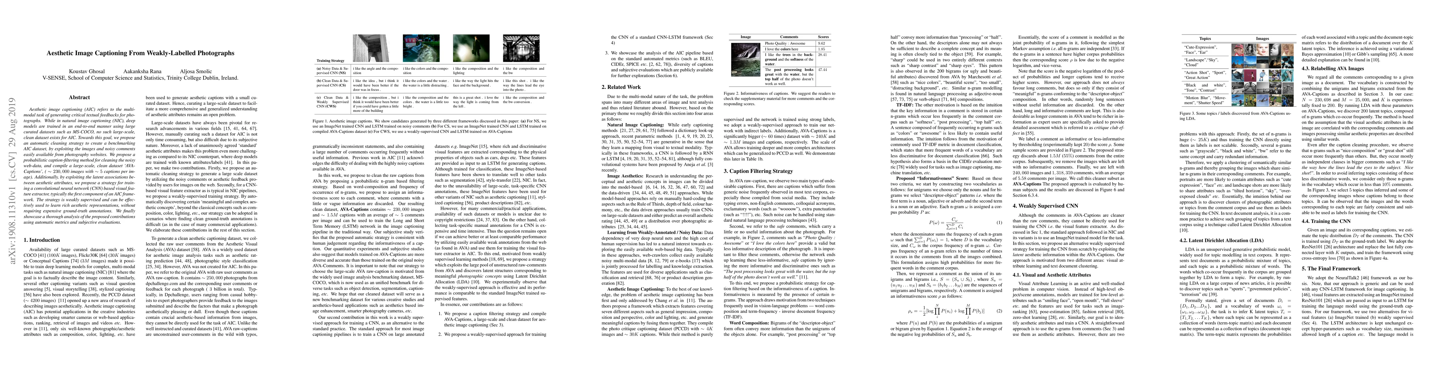 This research paper introduces a method for generating textual feedback for aesthetically captioned images using weakly-labeled photographs. The authors propose an automatic cleaning strategy to create a benchmarking dataset, "AVA-Captions," and develop a weakly supervised strategy for training a CNN-based visual feature extractor to learn rich aesthetic representations. The contributions are evaluated using both automatic metrics and subjective assessments.