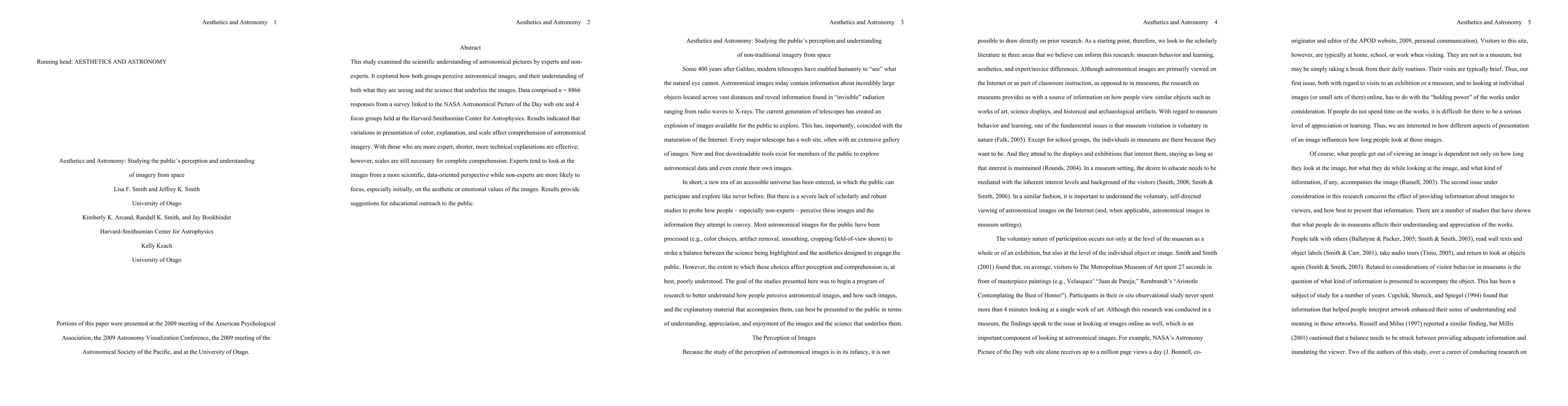 Some 400 years after Galileo, modern telescopes have enabled humanity to "see" what the natural eye cannot. Astronomical images today contain information about incredibly large objects located across vast distances and reveal information found in "invisible" radiation ranging from radio waves to X-rays. The current generation of telescopes has created an explosion of images available for the public to explore. This has, importantly, coincided with the maturation of the Internet. Every major telescope has a web site, often with an extensive gallery of images. New and free downloadable tools exist for members of the public to explore astronomical data and even create their own images. In short, a new era of an accessible universe has been entered, in which the public can participate and explore like never before. But there is a severe lack of scholarly and robust studies to probe how people - especially non-experts - perceive these images and the information they attempt to convey. Most astronomical images for the public have been processed (e.g., color choices, artifact removal, smoothing, cropping/field-of-view shown) to strike a balance between the science being highlighted and the aesthetics designed to engage the public. However, the extent to which these choices affect perception and comprehension is, at best, poorly understood. The goal of the studies presented here was to begin a program of research to better understand how people perceive astronomical images, and how such images, and the explanatory material that accompanies them, can best be presented to the public in terms of understanding, appreciation, and enjoyment of the images and the science that underlies them.