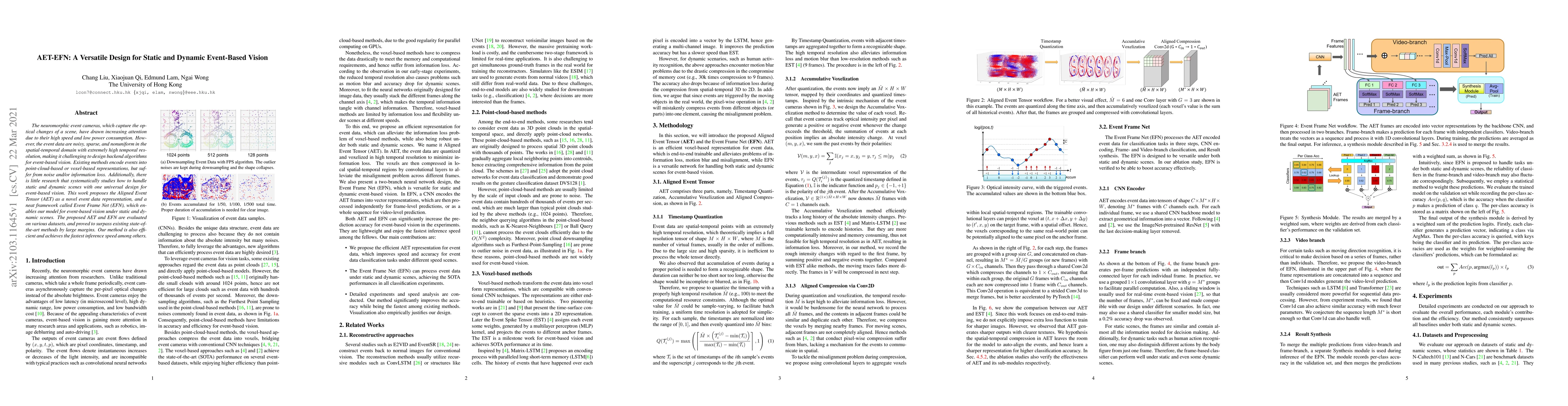 The neuromorphic event cameras, which capture the optical changes of a scene, have drawn increasing attention due to their high speed and low power consumption. However, the event data are noisy, sparse, and nonuniform in the spatial-temporal domain with an extremely high temporal resolution, making it challenging to design backend algorithms for event-based vision. Existing methods encode events into point-cloud-based or voxel-based representations, but suffer from noise and/or information loss. Additionally, there is little research that systematically studies how to handle static and dynamic scenes with one universal design for event-based vision. This work proposes the Aligned Event Tensor (AET) as a novel event data representation, and a neat framework called Event Frame Net (EFN), which enables our model for event-based vision under static and dynamic scenes. The proposed AET and EFN are evaluated on various datasets, and proved to surpass existing state-of-the-art methods by large margins. Our method is also efficient and achieves the fastest inference speed among others.