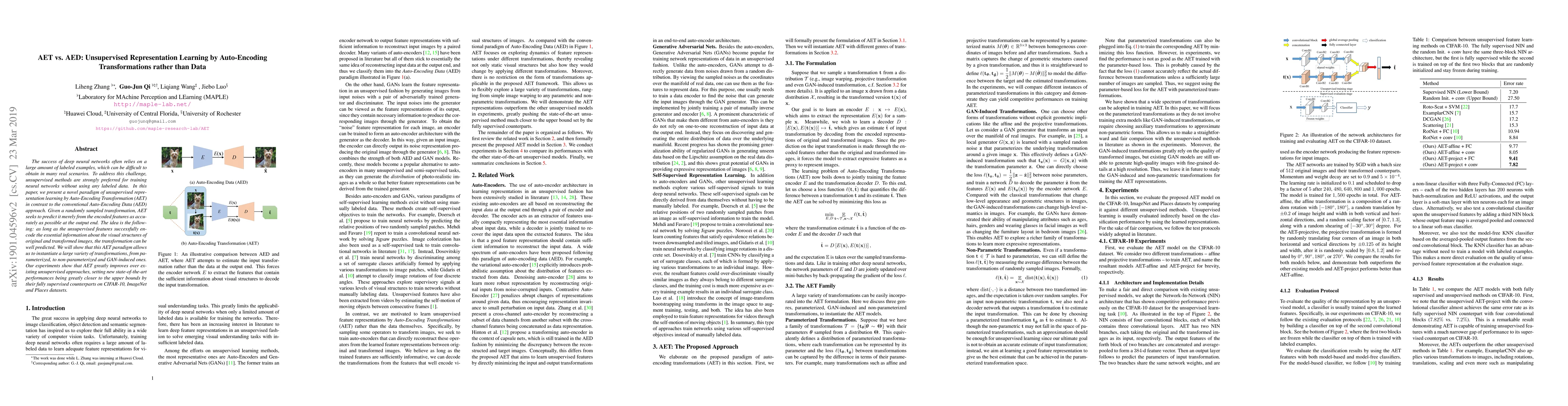 This paper introduces a novel unsupervised representation learning method called Auto-Encoding Transformations (AET) that predicts transformations from encoded features rather than data. AET outperforms conventional Auto-Encoding Data (AED) approaches, achieving state-of-the-art results on CIFAR-10, ImageNet, and Places datasets.