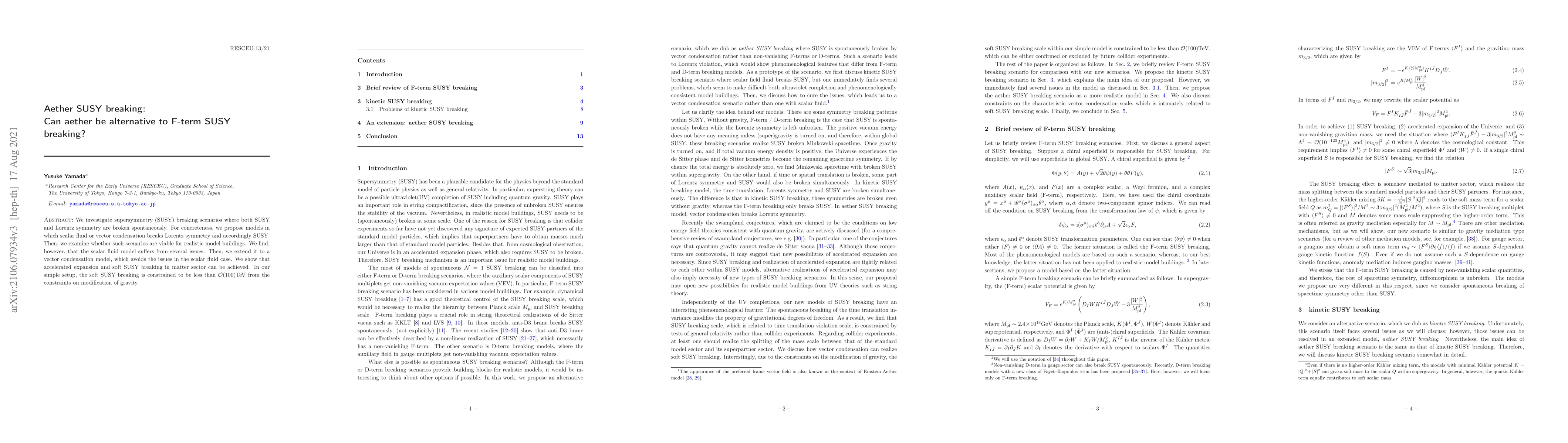 This paper explores an alternative to F-term supersymmetry breaking, proposing models where scalar fluid or vector condensation breaks both supersymmetry and Lorentz symmetry. It finds a viable model with accelerated expansion and soft supersymmetry breaking, constrained to be less than 100 TeV.