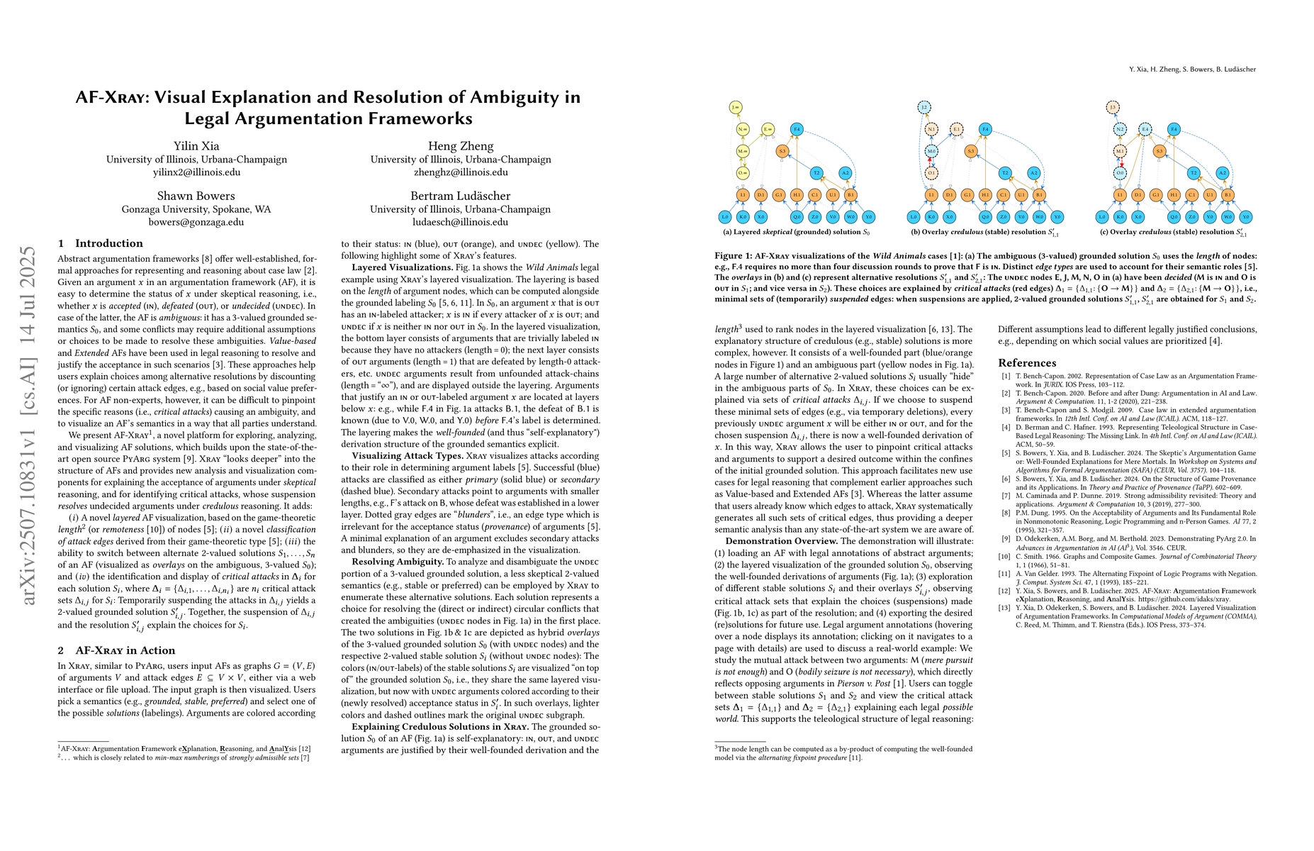 Argumentation frameworks (AFs) provide formal approaches for legal reasoning, but identifying sources of ambiguity and explaining argument acceptance remains challenging for non-experts. We present AF-XRAY, an open-source toolkit for exploring, analyzing, and visualizing abstract AFs in legal reasoning. AF-XRAY introduces: (i) layered visualizations based on game-theoretic argument length revealing well-founded derivation structures; (ii) classification of attack edges by semantic roles (primary, secondary, blunders); (iii) overlay visualizations of alternative 2-valued solutions on ambiguous 3-valued grounded semantics; and (iv) identification of critical attack sets whose suspension resolves undecided arguments. Through systematic generation of critical attack sets, AF-XRAY transforms ambiguous scenarios into grounded solutions, enabling users to pinpoint specific causes of ambiguity and explore alternative resolutions. We use real-world legal cases (e.g., Wild Animals as modeled by Bench-Capon) to show that our tool supports teleological legal reasoning by revealing how different assumptions lead to different justified conclusions.