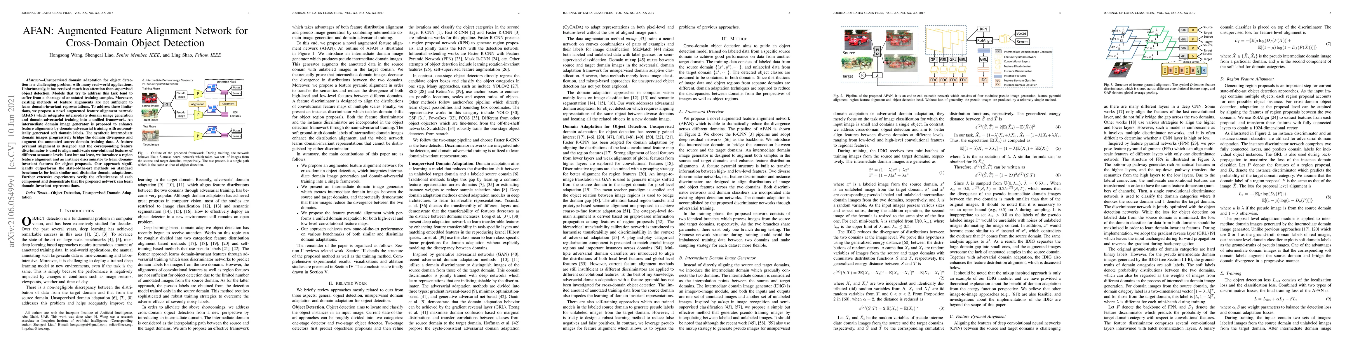 The paper proposes an Augmented Feature Alignment Network (AFAN) to tackle the challenge of unsupervised domain adaptation for object detection, integrating intermediate domain image generation and domain-adversarial training to enhance feature alignments and learn domain-invariant representations. The method significantly outperforms existing approaches on standard benchmarks.