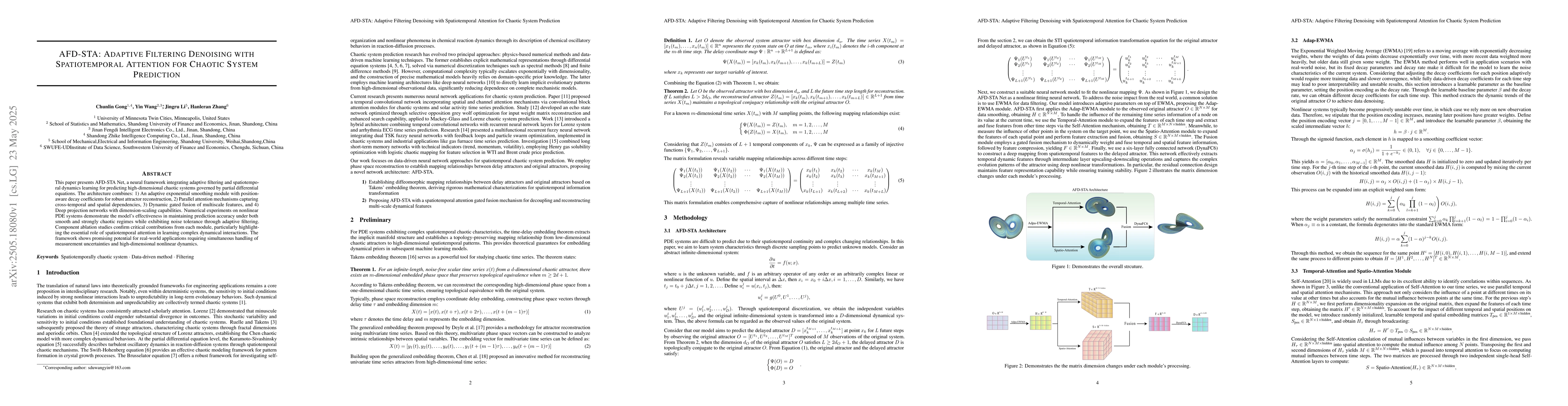 The main technical contribution is the development of AFD-STA Net, a novel neural framework integrating adaptive filtering and spatiotemporal attention for chaotic system prediction.